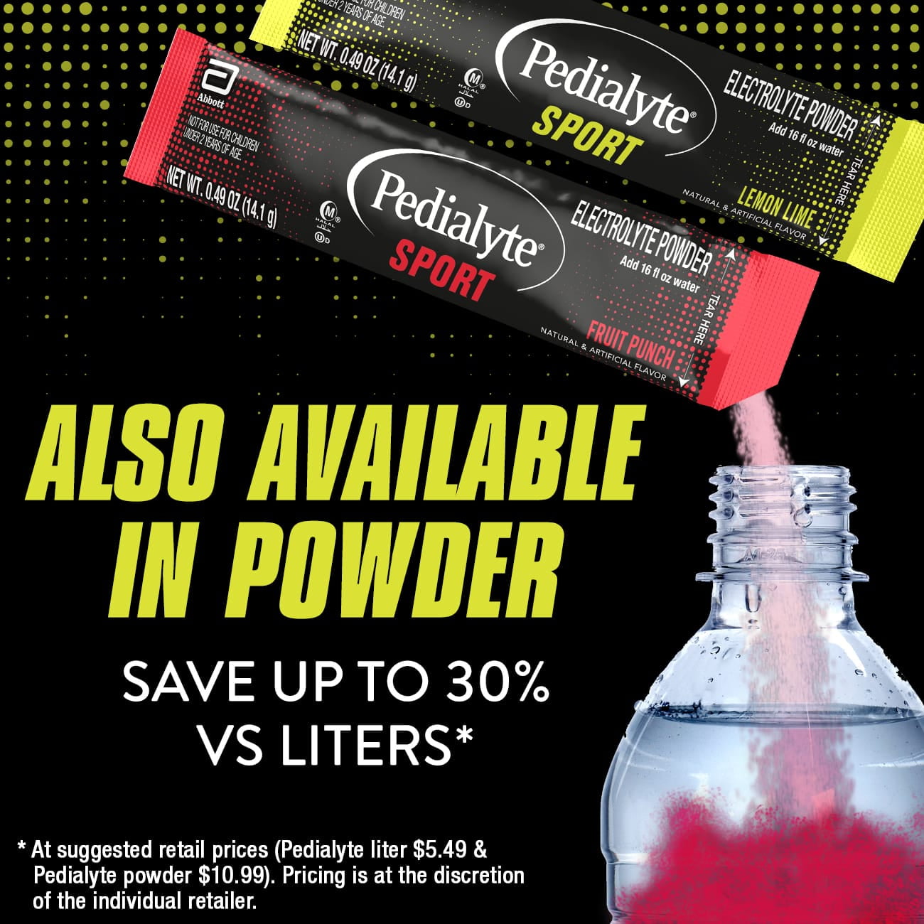Pedialyte Sport has a scientifically designed balance of electrolytes and sugar, with 3x the electrolytes and ¼ the sugar of the leading sports drinks.* It’s formulated for athletes to provide fast hydration and muscle support before, during, and after exercise. And it has 5 key electrolytes that help replace what is lost in sweat during intense workouts: sodium (to avoid muscle cramping), chloride (for fluid balance), potassium (for muscle and nerve function), magnesium (for muscle health), and phosphate (for muscle repair). From the hydration brand that has been used by professional sports teams for decades, Pedialyte Sport is available in ready-to-drink liters and convenient powder packs that go anywhere you do. It comes in 2 great flavors: Fruit Punch and Lemon Lime. * Pedialyte Sport products have 1380mg sodium and no more than 14g sugar per liter; leading sports drinks have ≈460mg sodium and ≈58g sugar per liter.†in select stores, The SNAP (Supplemental Nutrition Assurance Program) name is a service mark of the U.S. Department of Agriculture. USDA does not endorse any goods, services, or enterprises.