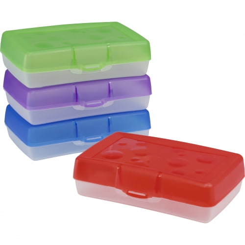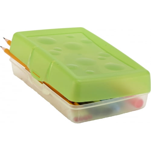 This pencil box had a solid one-piece construction using advanced plastic molding techniques. It has a clear bottom which allows for easy content identification, a colored top as well as a secure latch and hinge. Number of Compartments: 1 Material Family: Plastic Materials: Plastic Width: 8.38".