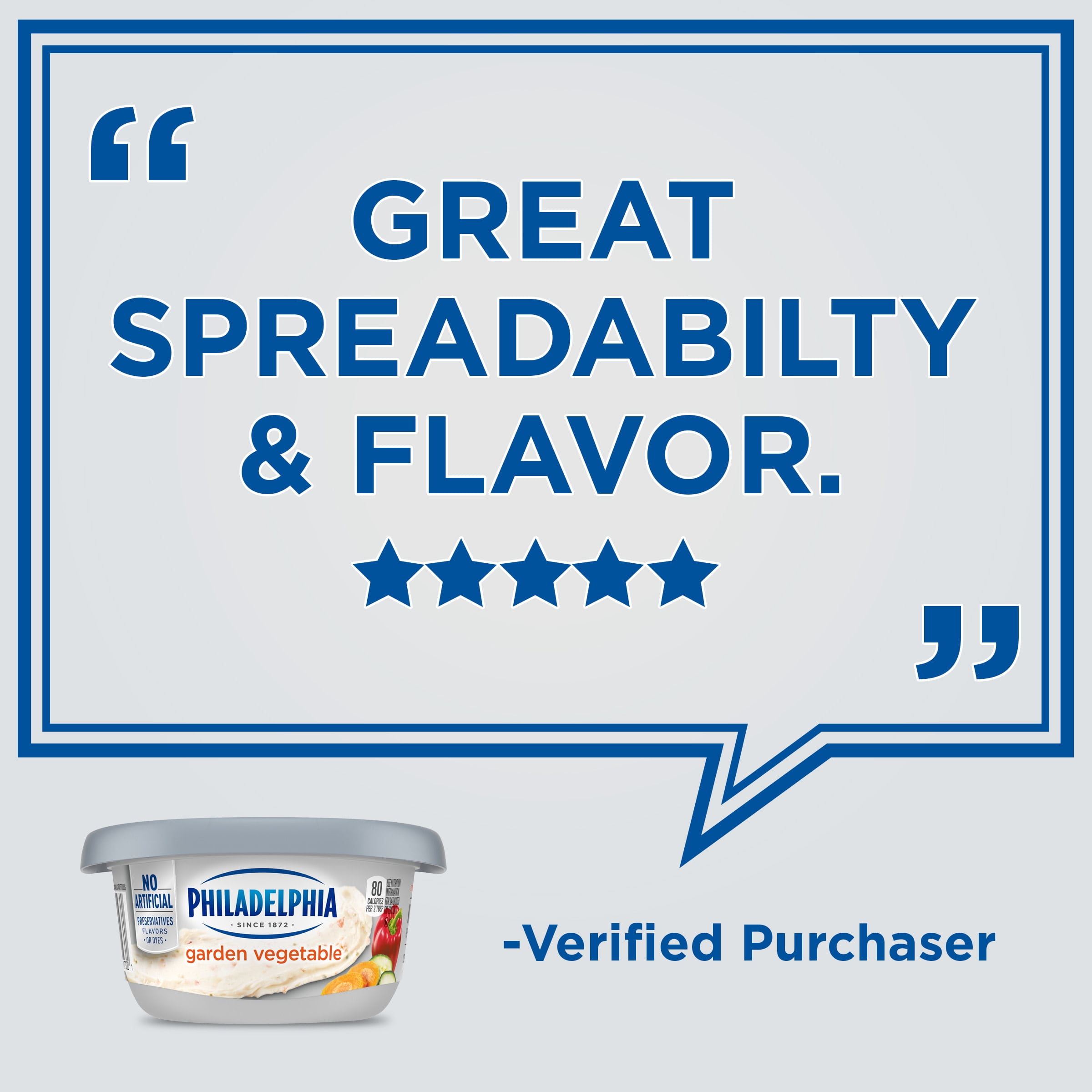 Philadelphia Garden Vegetable Cream Cheese Spread is made with fresh milk and cream plus real veggies. It Our spreadable cream cheese has no artificial preservatives, flavors or dyes. Savory and creamy Philadelphia Cream Cheese Spread is perfect for spreading on your warm, toasty morning bagel. Try it with crackers as an afternoon snack. Serve it at all your holiday brunch occasions. Each 7.5 oz. cream cheese spread tub is conveniently resealable to lock in freshness.
