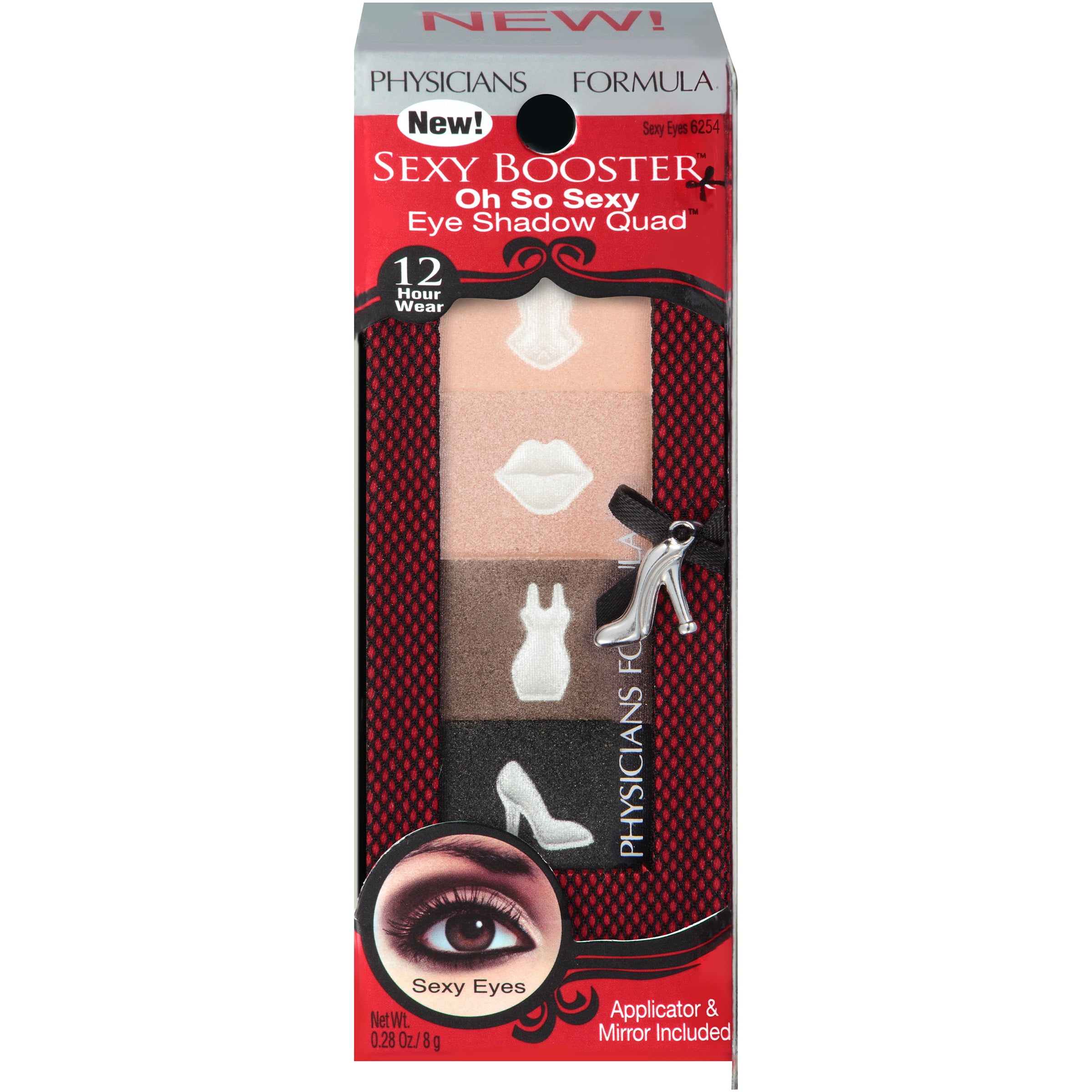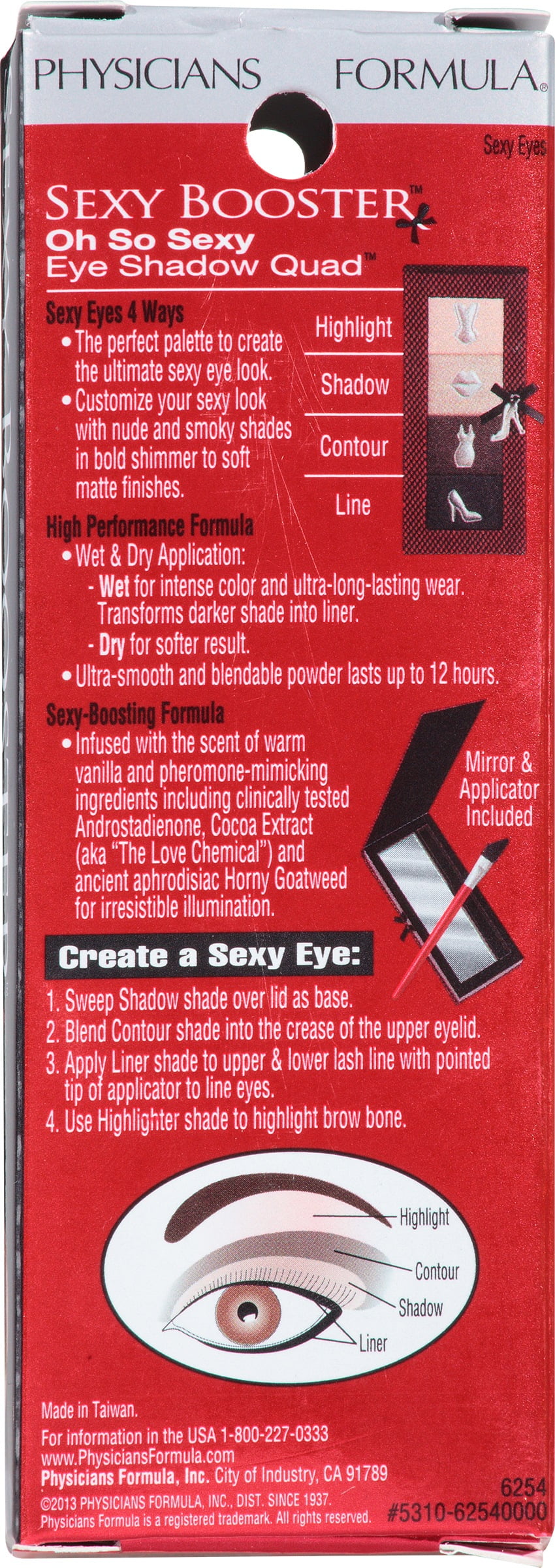 - 12 hour wear. Applicator & mirror included. Sexy Eyes 4 Ways: The perfect palette to create the ultimate sexy eye look. Customize your sexy look with nude and smoky shades in bold shimmer to soft matte finished. High Performance Formula: Wet & Dry Application: Wet for intense color and ultra-long-lasting wear. Transforms darker shade into liner; Dry for softer result. Ultra-smooth and blendable powder lasts up to 12 hours. Sexy-Boosting Formula: Infused with the scent of warm vanilla and pheromone-mimicking ingredients including clinically tested androstadienone, cocoa extract (aka The Love Chemical) and ancient aphrodisiac horny goatweed for irresistible illumination. Highlight. Shadow. Contour. Line. For information www.PhysiciansFormula.com. Since 1937. Sexy by Day – nude. Sexy by Night – smoky. Hypoallergenic. Paraben free. Gluten free. Dermatologist approved. Safe for sensitive eyes and contact lens wearers. Made in Taiwan.