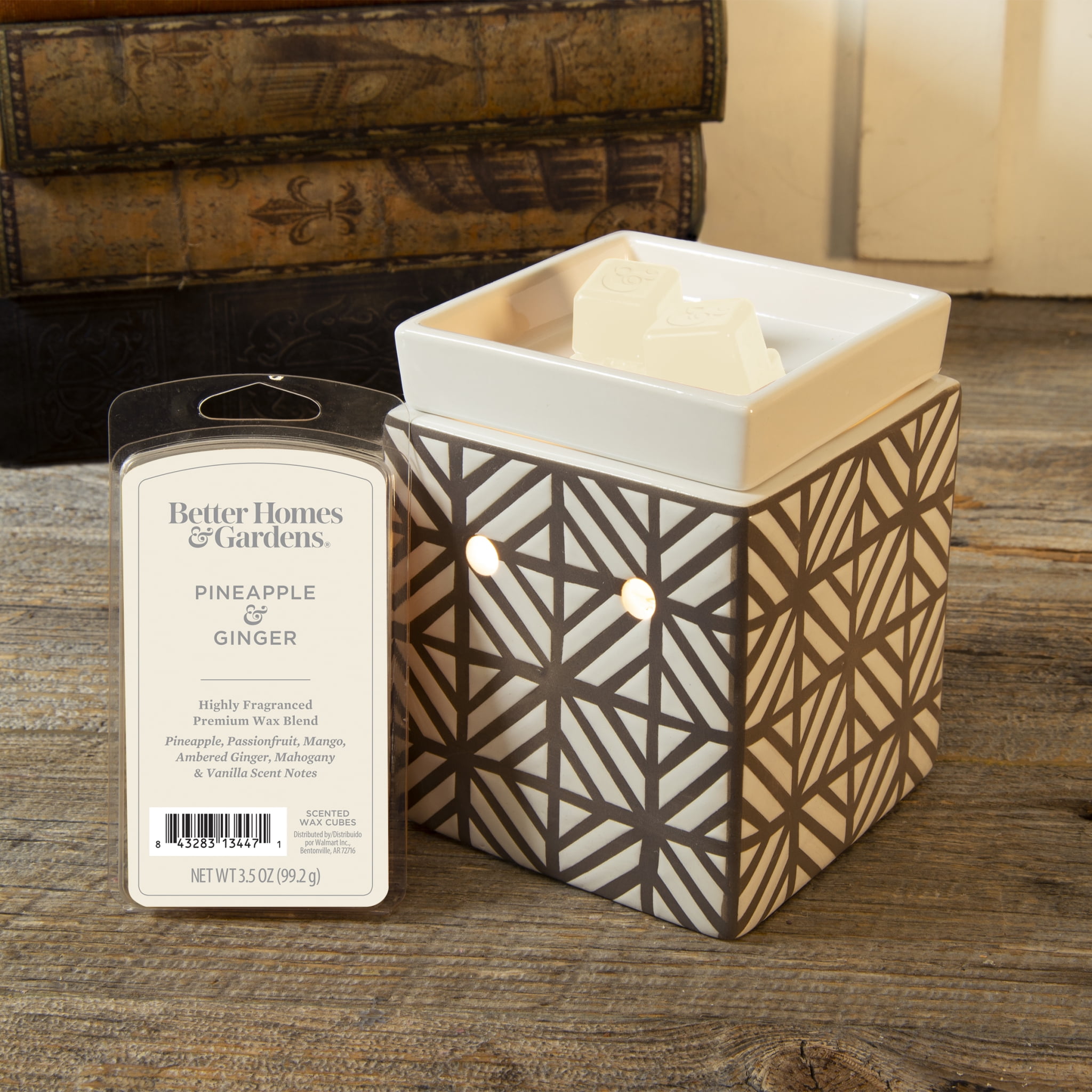 Better Homes & Gardens 3.5 oz Pineapple & Ginger Premium Scented Wax Melt features warm elements of dark vanilla, ambered ginger root, pineapple palm, and rich mahogany with added depth of ripe, nectarous pineapple, luscious passionfruit, and wild mango splashed with golden citron. Better Homes & Gardens 3.5 oz Pineapple & Ginger Scented Wax Melts are for use in an fragrance warmer and release a soothing highly fragrant scent into the air immediately upon melting. These premium wax melts are ideal for spreading a relaxing scent and welcoming atmosphere throughout your home. This premium wax melt line features more fragrance per cube with elevated fragrance notes. Simply break off a piece and add it to your favorite fragrance warmer.