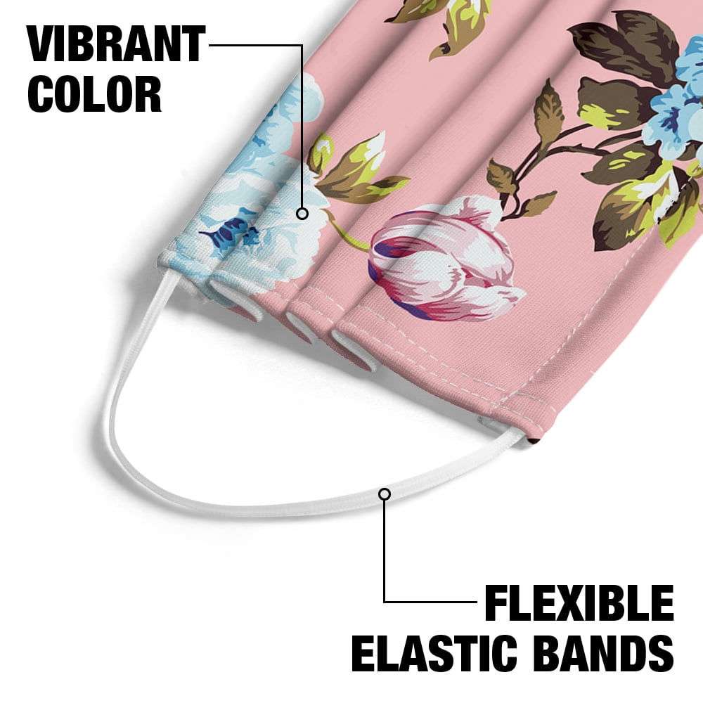 - PINK AND BLUE FLORAL PATTERN FACE MASK – Our 100% polyester mask is made with 1 layer that is printed with your favorite design.
