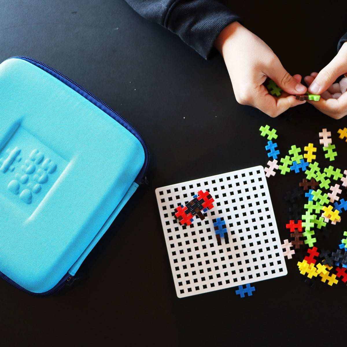 Carry your Plus-Plus pieces and baseplate with you everywhere. The Travel case is great to take to restaurants, road trips, anytime you are on the go. Plus-Plus Travel Case contains 100 Plus-Plus pieces and 1 white Baseplate. It has a durable fabric exterior over a flexible but rugged case with a convenient carry handle.Plus-Plus is made in Denmark in our own zero-plastic-waste factory powered by renewable energy. Each piece easily connects to the next and lets your imagination create colorful flat mosaics or work in 3-D to make more intricate builds. Even curves are possible thanks to the unique design of this deceptively simple shape! A perfect STEM toy to develop fine motor skills, focus and patience – as well as design, imagination and creativity!