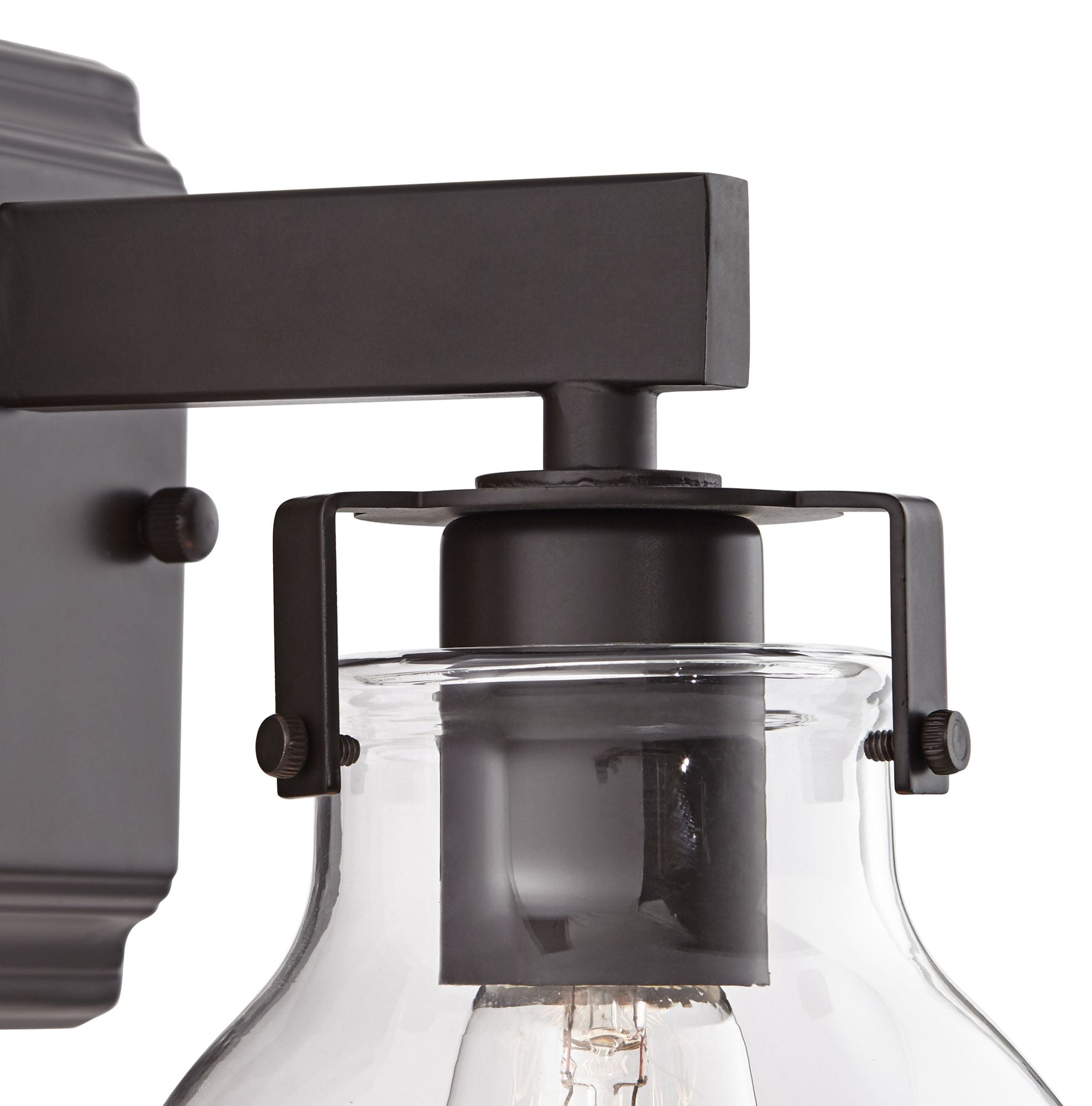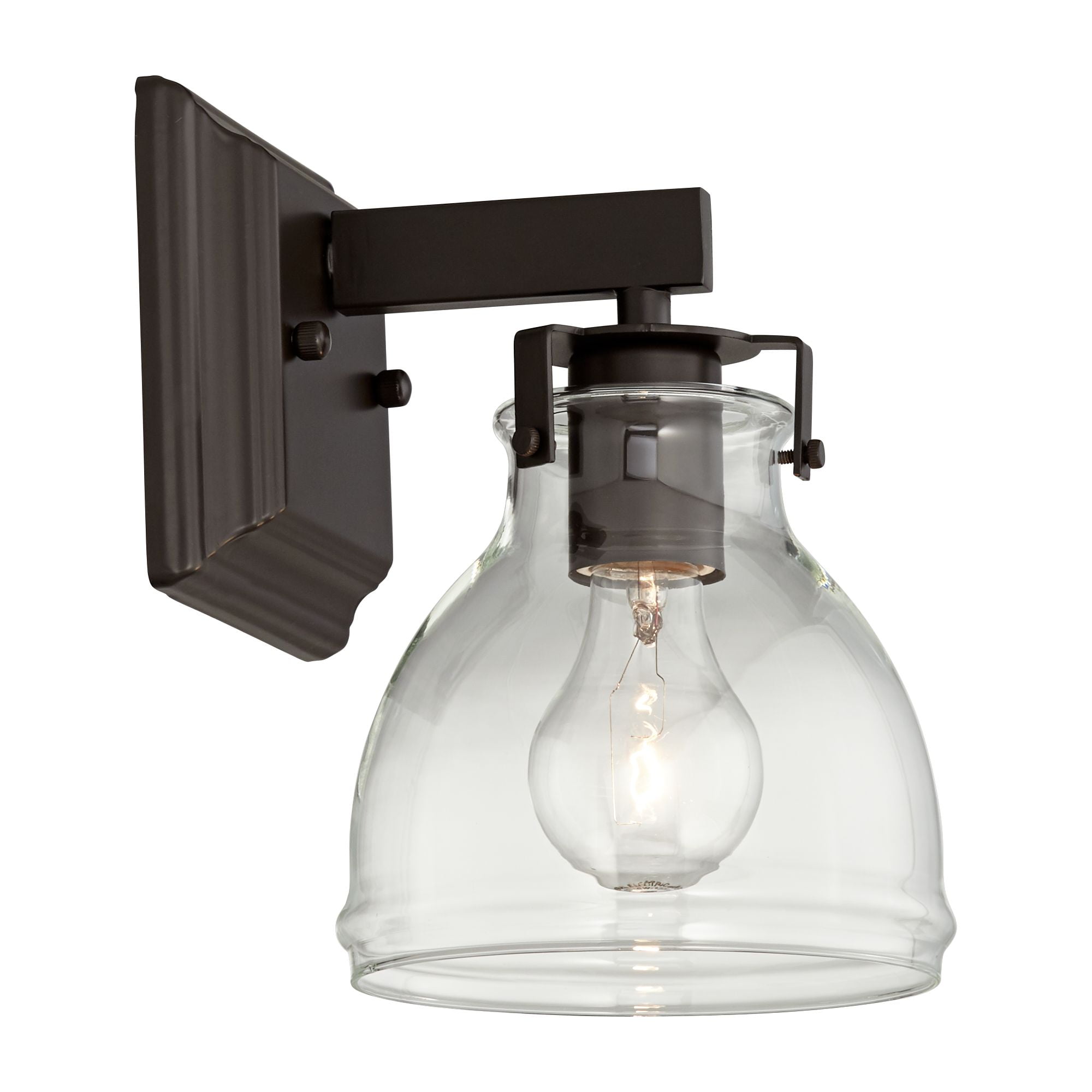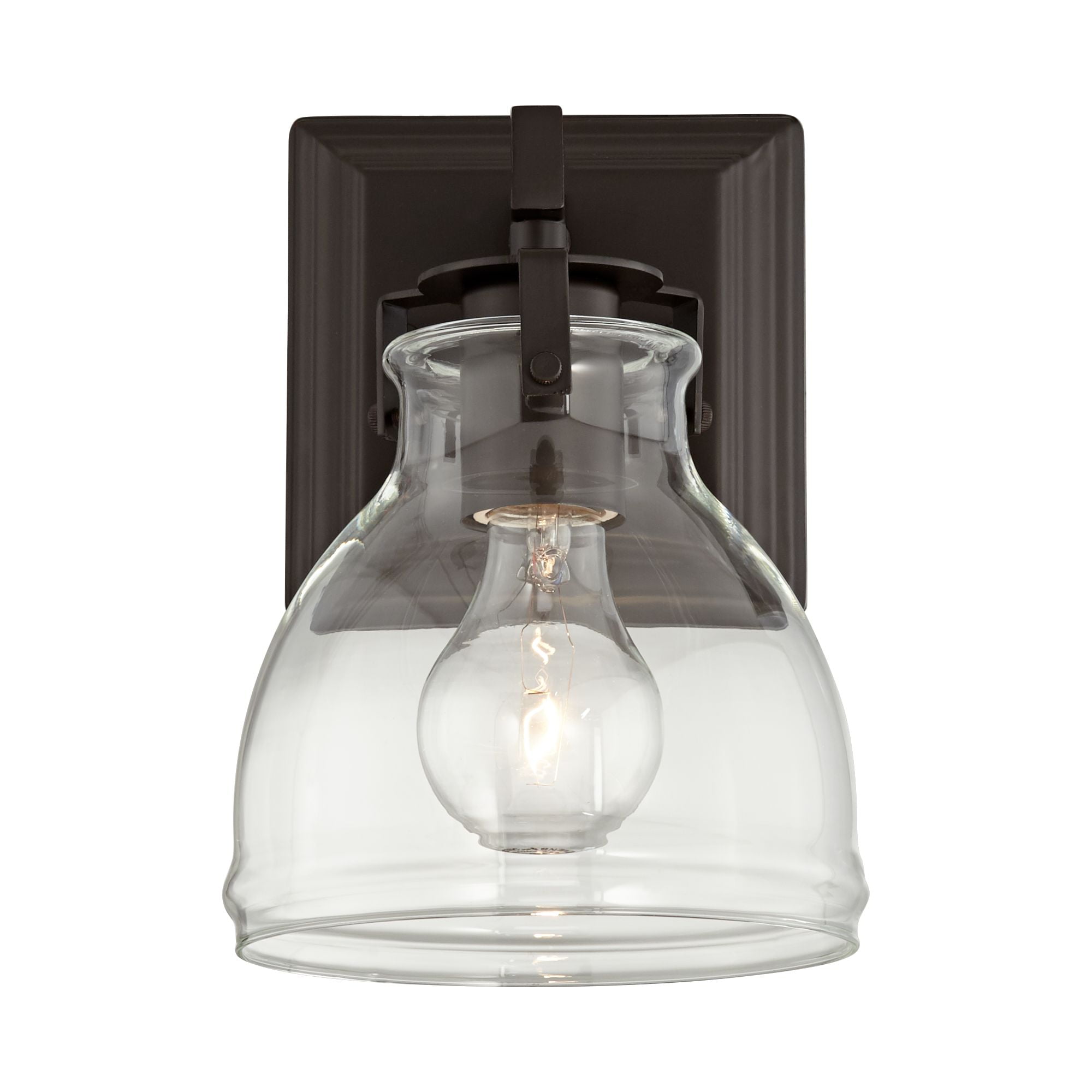 - Bronze finish. Clear glass shade. Fixture can be installed with the glass pointing up or down.