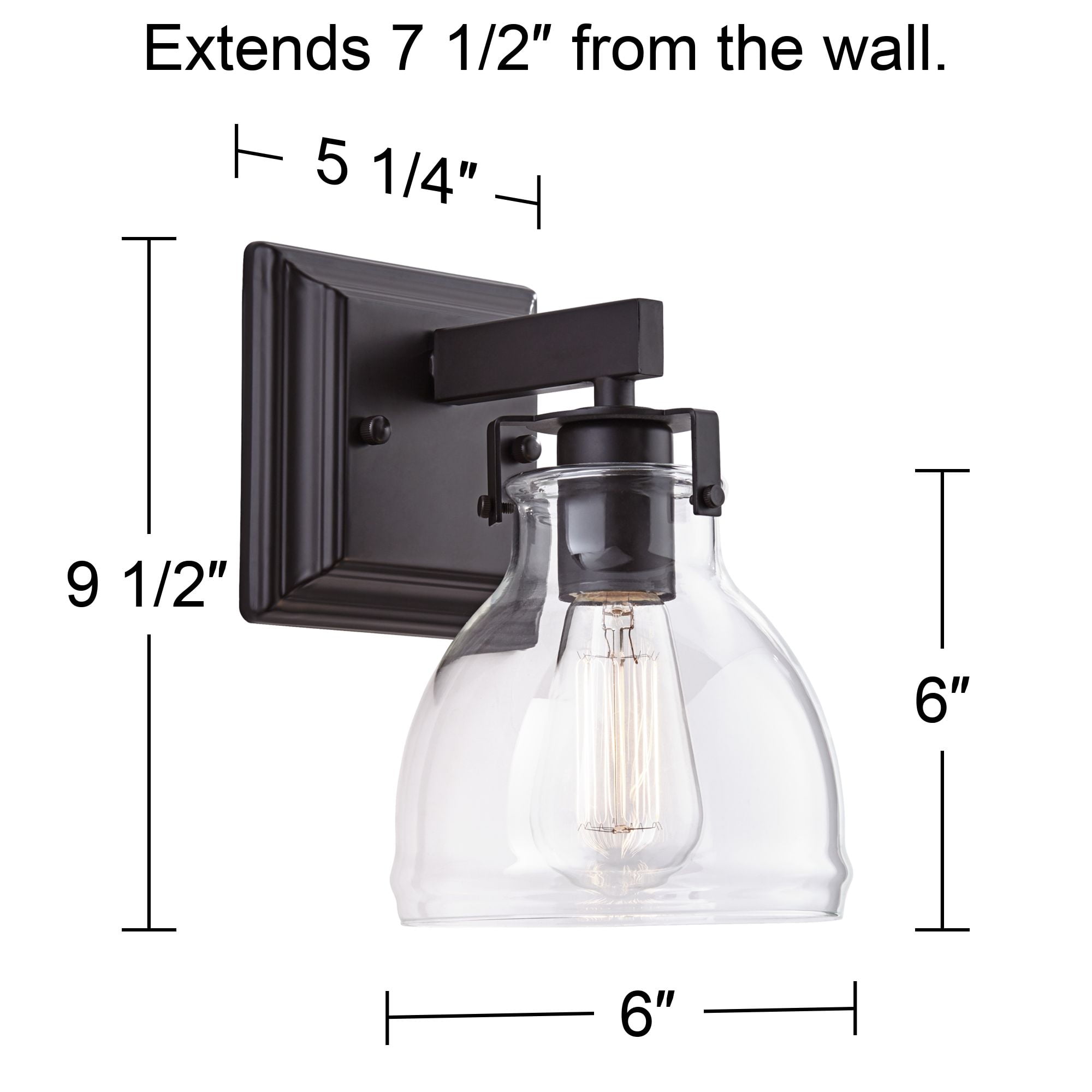 - 9 1/2" high x 6" wide. Glass only is 6" high x 6" wide. Extends 7 1/2" from the wall. Square backplate is 5 1/4" wide x 1 1/4" deep. Weighs 2 lbs.