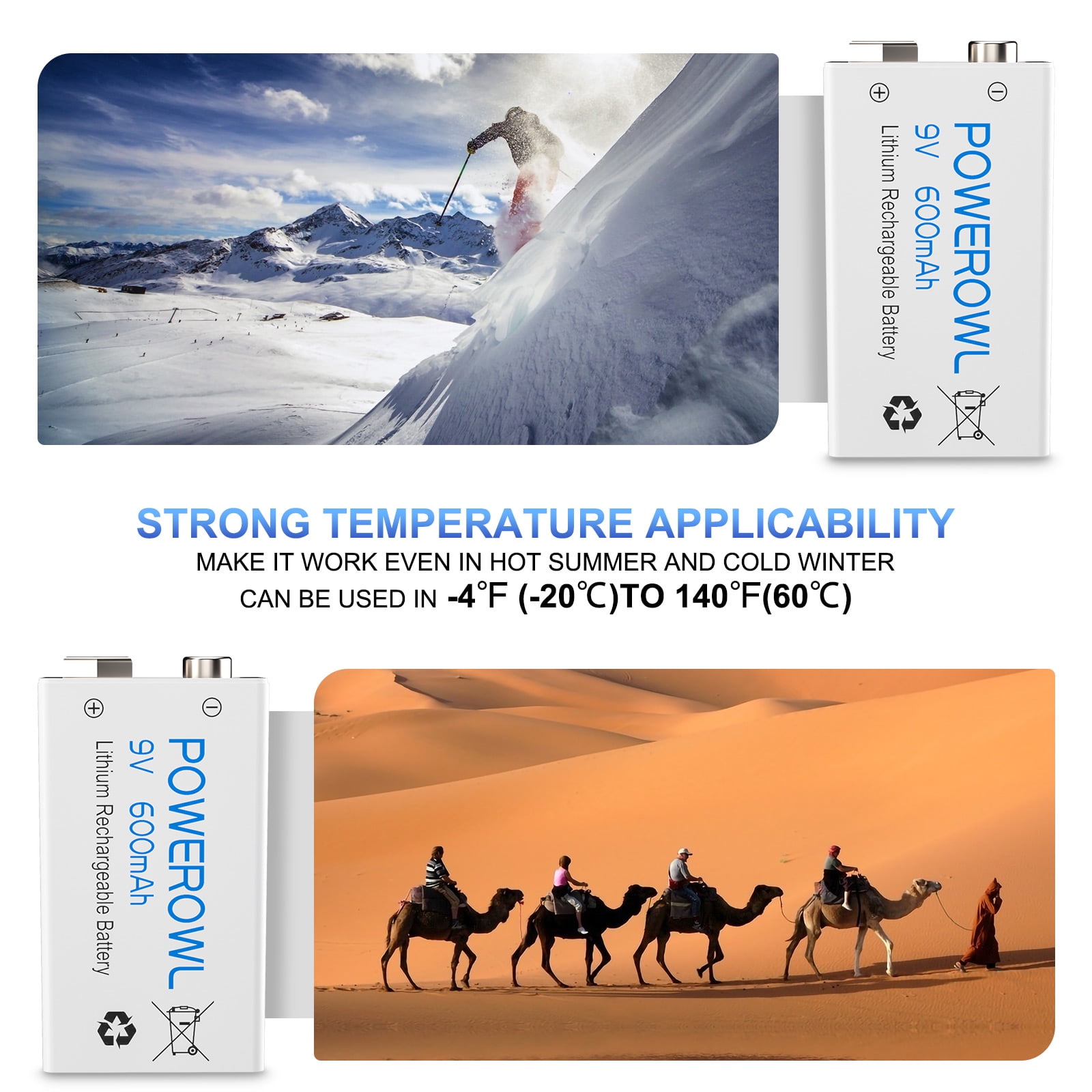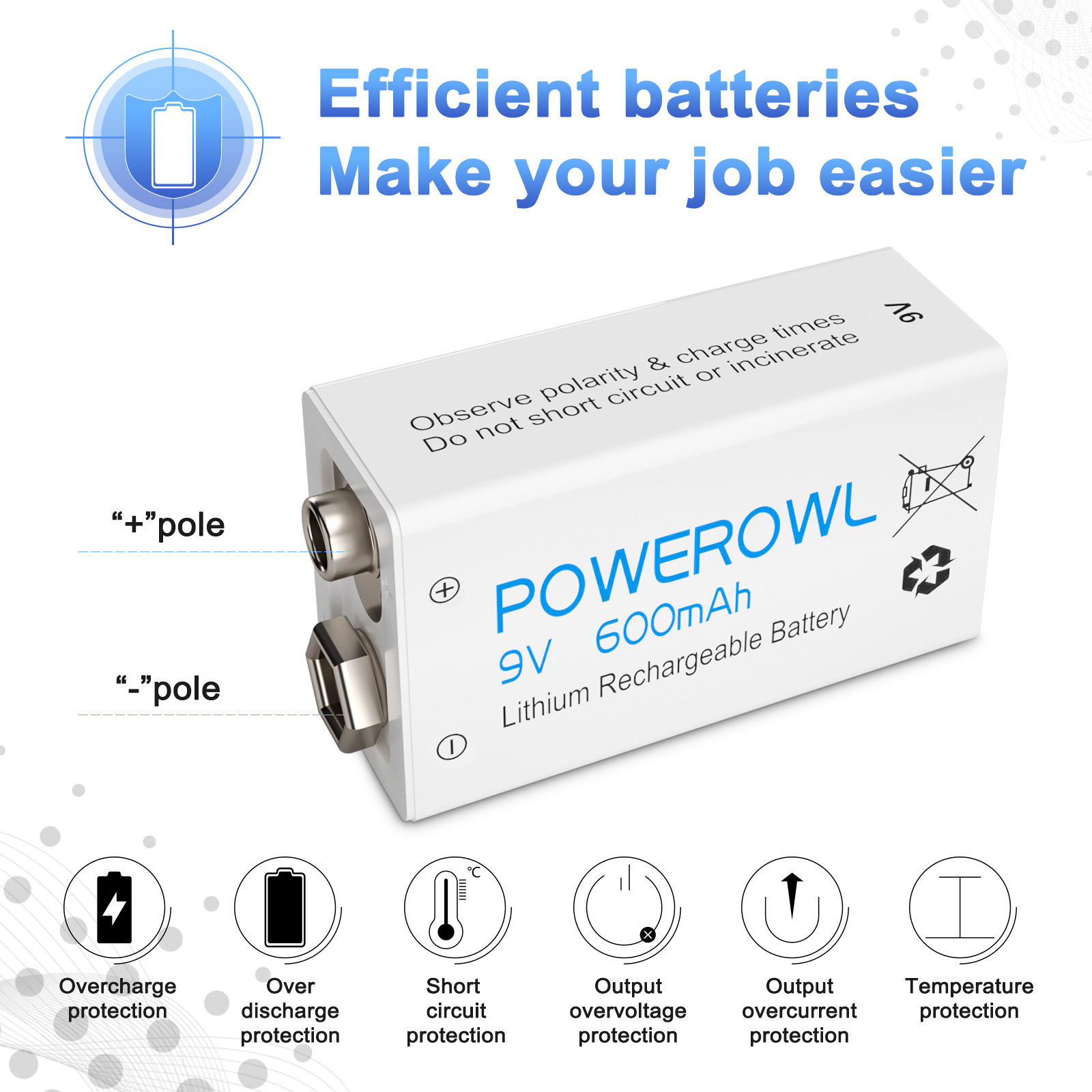 POWEROWL Rechargeable 9V Batteries are an excellent fit for people who want to recharge and reuse the same batteries to prevent waste. This pack includes four POWEROWL 600mAh rechargeable batteries and one POWEROWL battery charger, which can charge up to four batteries at a time. Rechargeable 9V battery is high capacity and durable. They provide a considerably longer run time than conventional Nickel Cadmium batteries. POWEROWL 9 volt battery may be recharged up to 1,200 times in any 9V battery charger.