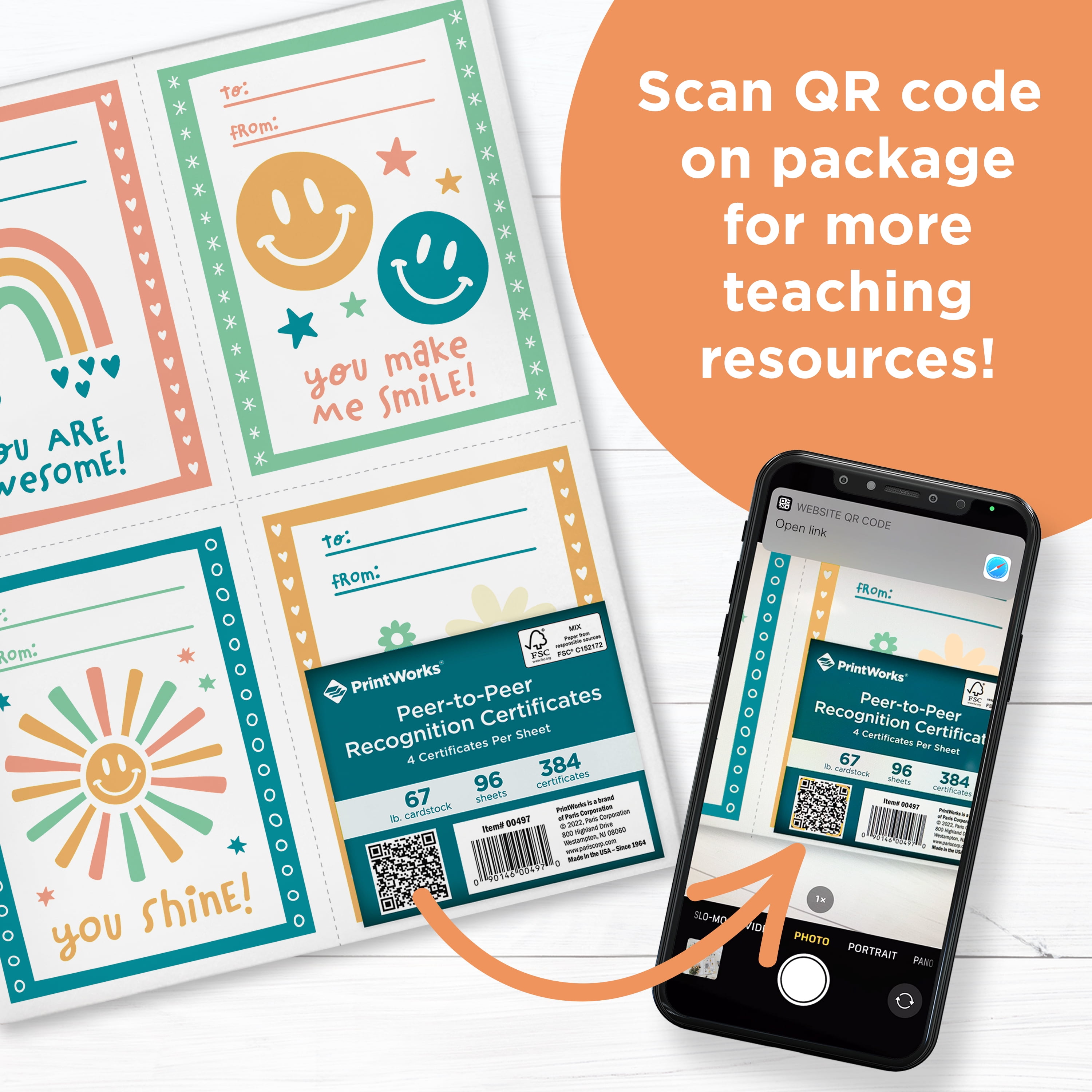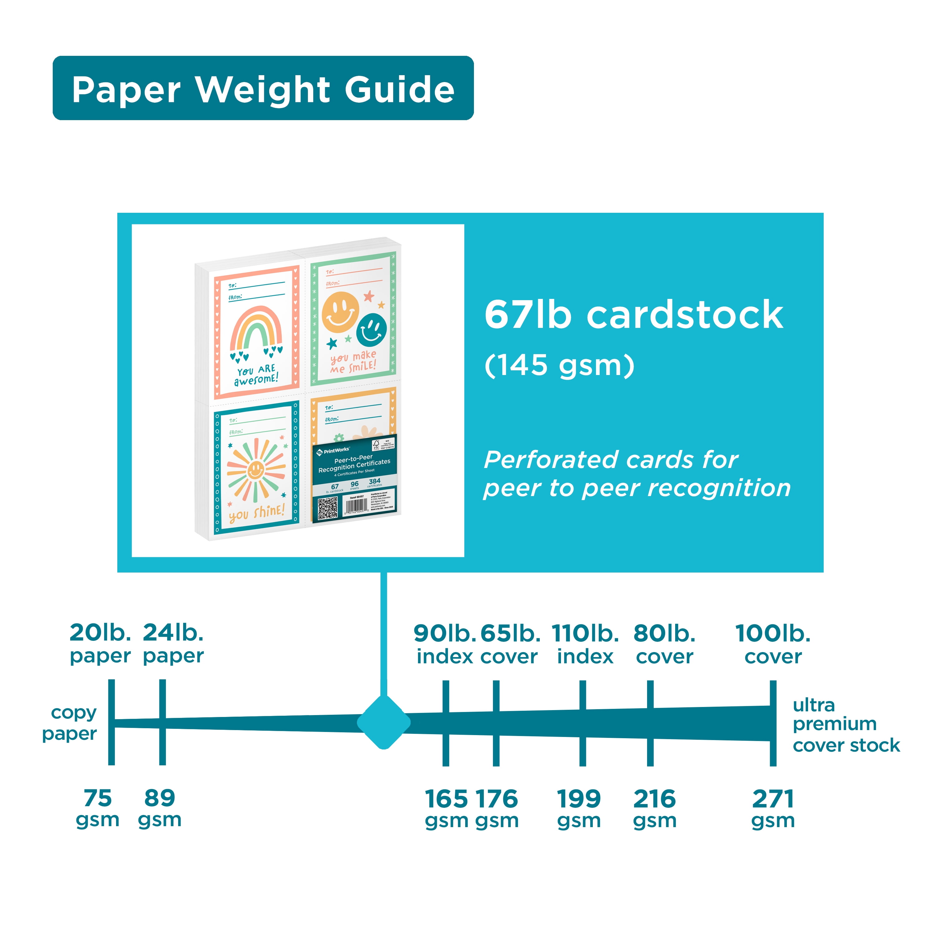 Empower students through peer recognition and encourage a positive classroom community! PrintWorks Peer Recognition Cards are a great way to promote kindness and unity among students. Students can recognize their peers with a variety of statements. Each pack includes 96 sheets with 4 perforated cards on each sheet. The heavyweight construction of each sheet is great for handing out, hanging on bulletin boards, or even framing. PrintWorks Peer Recognition Cards are a fun an encouraging award for students. Printer-friendly in inkjet and laser printers. PrintWorks is a brand of Paris corporation. Since 1964 we have been the experts on manufacturing quality forms and specialty paper for use in homes, offices, and high-volume production facilities. Our products range from pre-perforated and pre-punched papers to secure prescription and check blanks to specialty papers, colored paper/cardstocks, Labels, business cards and t-shirt transfers. You can print responsibly knowing that this paper is made with FSC-certified wood fibers from responsibly managed North American forests. Stringently specified. Meticulously crafted. Assured quality. Affordable reliability. All our products come with 100% Satisfaction.