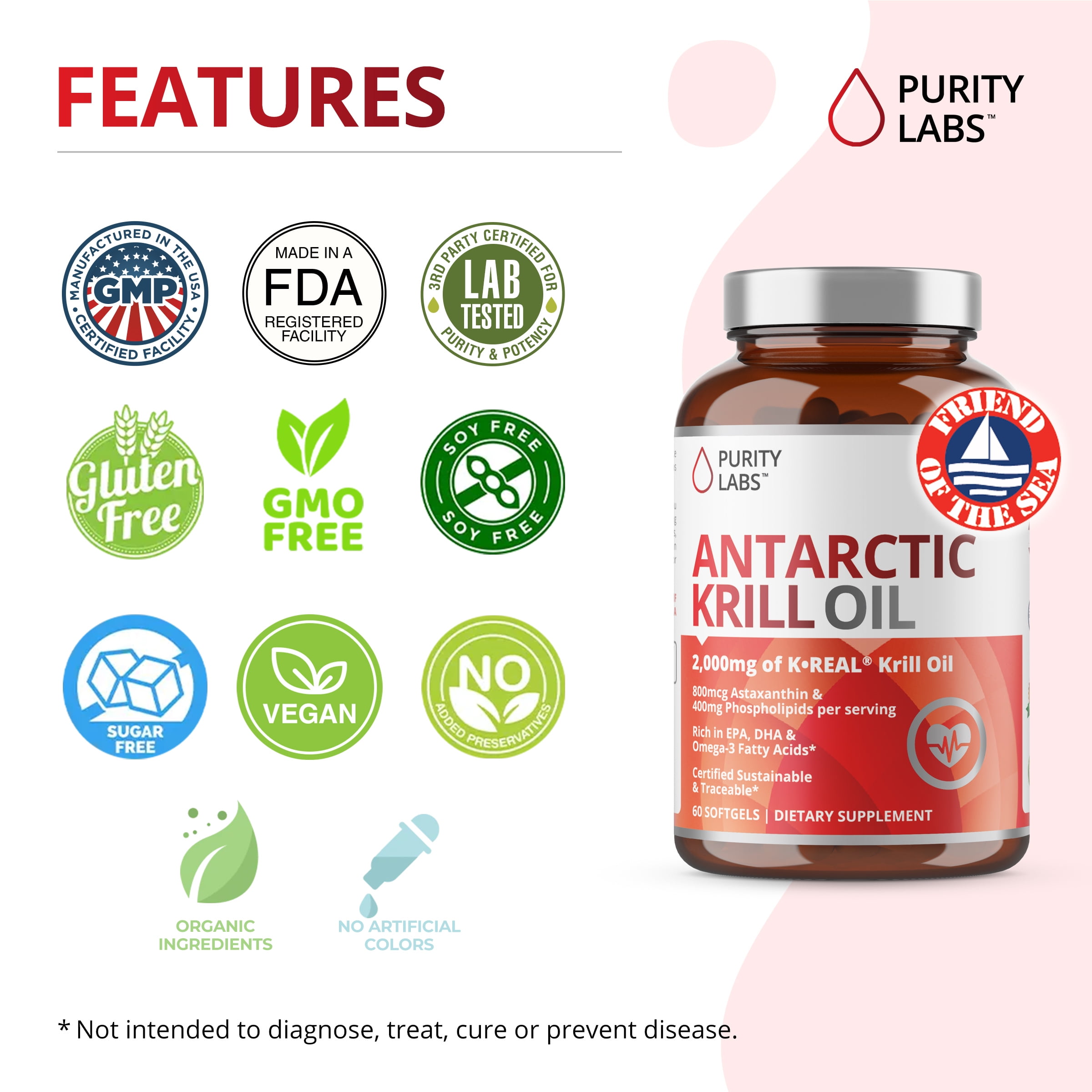 Purity Labs’ high potency Antarctic Krill Oil unites essential Omega 3 EPA & DHA with the antioxidant Astaxanthin for a powerful combination. This provides you more nutrients, cardiovascular benefits, and immune system boost. It can help support heart, eyes, and skin health, and may even improve mood and digestion.