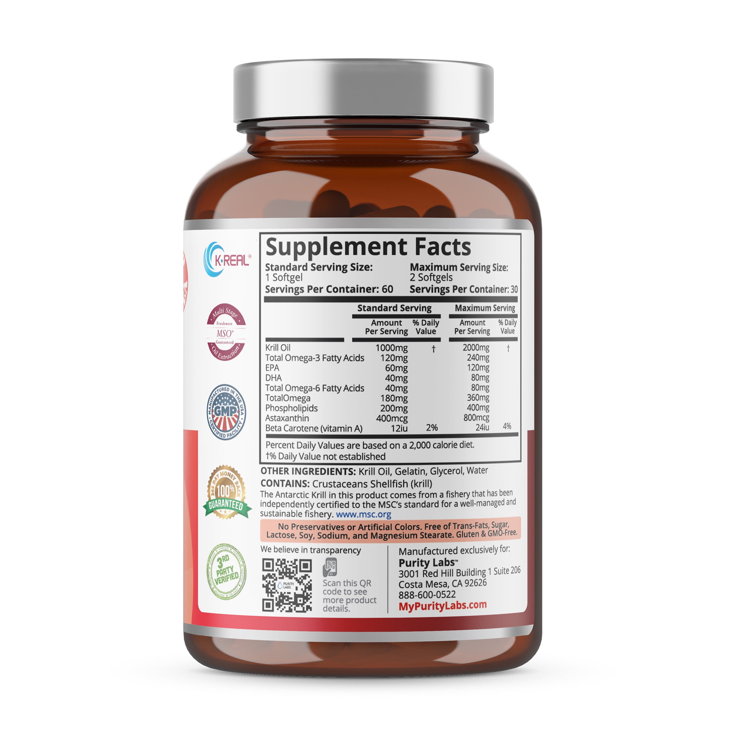 1 serving (2 softgels) contains 2,000mg of Pure Antarctic Krill Oil combined with 800mcg Astaxanthin and 400mcg of PhospholipidsEach bottle contains 30 max servings / 60 softgels