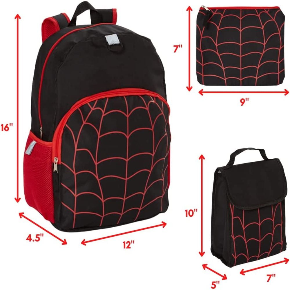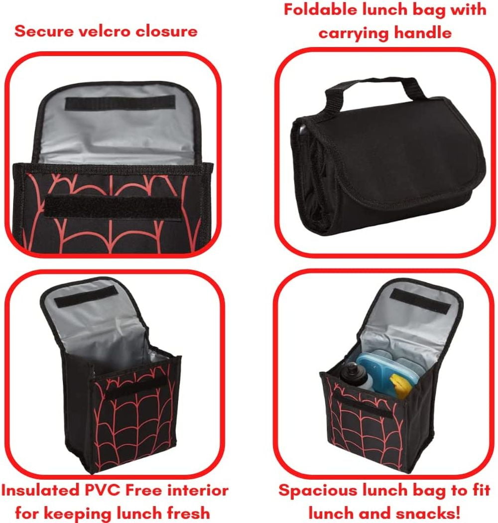 - 6 PIECE BOYS BACKPACK BUNDLE – This black backpack with a bright red spiderweb comes with a BPA-free water bottle, a large pencil holder, a foldable insulated lunch box, a carabiner clip, a pop it keychain and is ideal for boys aged 6 to 15 years. The school bag has enough space to accommodate everything he needs without being too heavy on his shoulders.