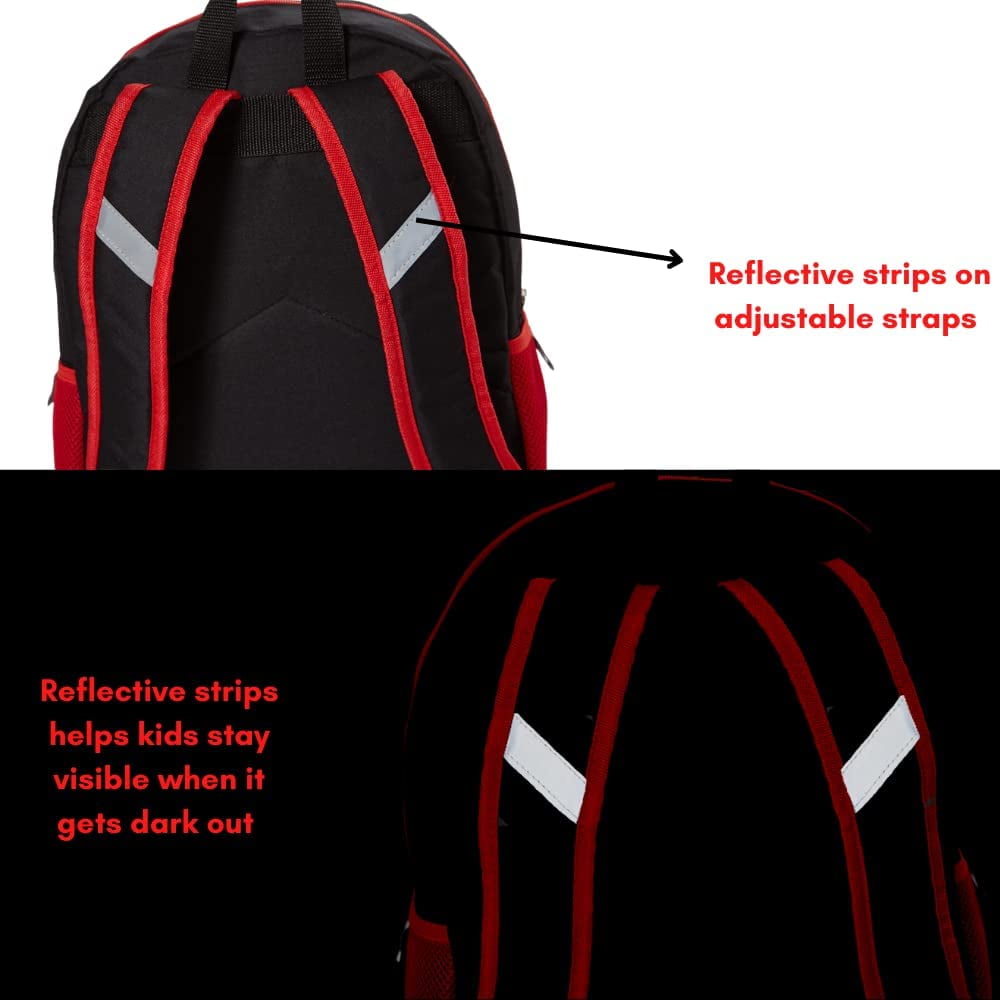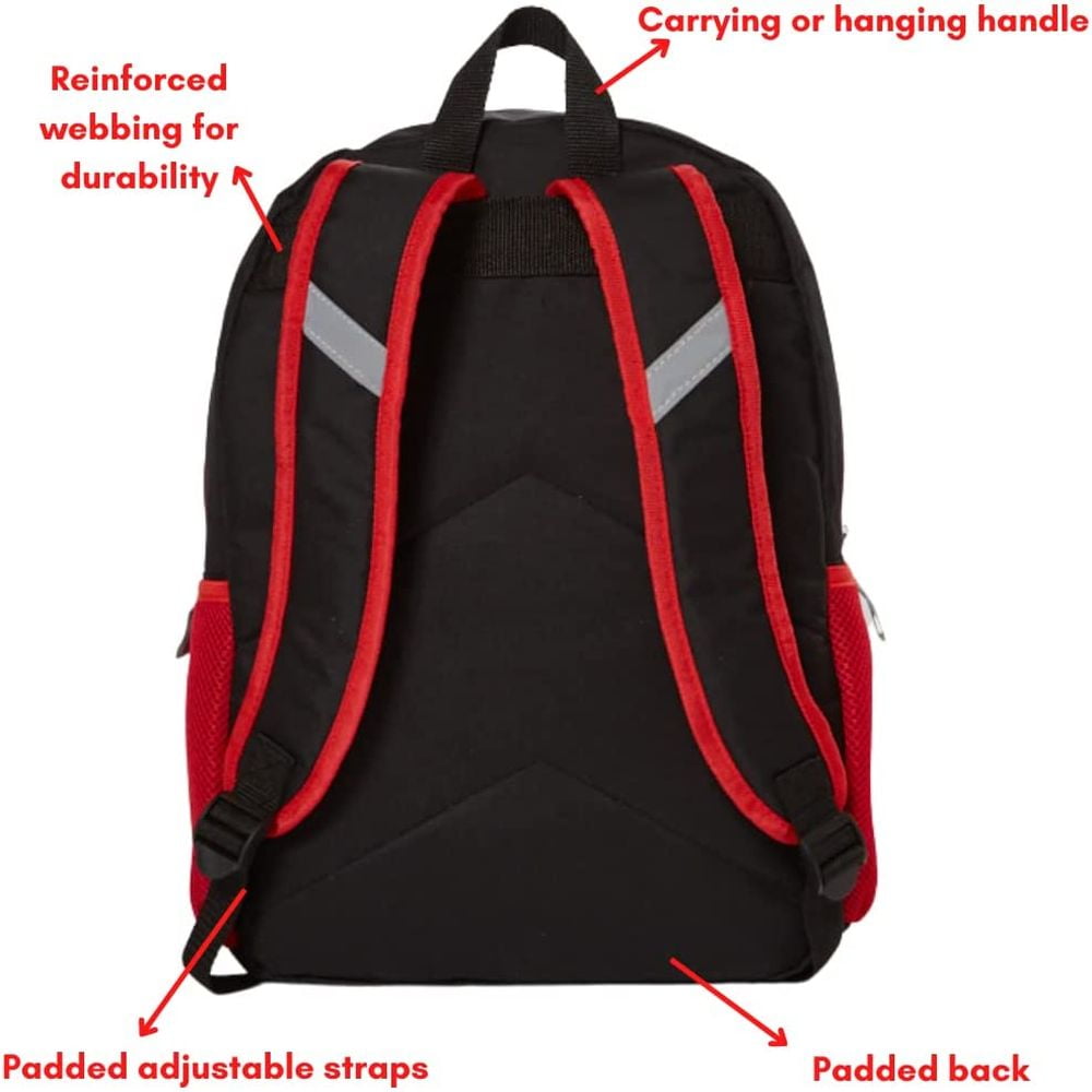 With this 6-piece backpack set, he’ll have everything he needs for school. The black bookbag with a large red spiderweb print includes a soft lunch box, a clip, a zippered pencil case, a water bottle, and a keychain fidget popper, all together in this exciting bundle. The boys backpack features mesh elasticized drink pockets on both sides, a personalized label on the inside, extra padding on the backstraps for added comfort, and a big front zip pocket for organizing all his school supplies. For hands-free travel to and from school, attach the insulated lunch bag, pencil pouch, and popper keychain to the front of the backpack with the included carabiner clip. The reflective strips on all four (4) sides of the school bag increase your child’s visibility and help to keep little boys safe to and from the bus. He’ll be ready for whatever greets him this season, whether he’s traveling, attending school, or participating in extracurricular activities. This 16-inch black and red kids backpack (16 x 12 x 4.5 in.) is perfect for ages 6 to 15 years old.