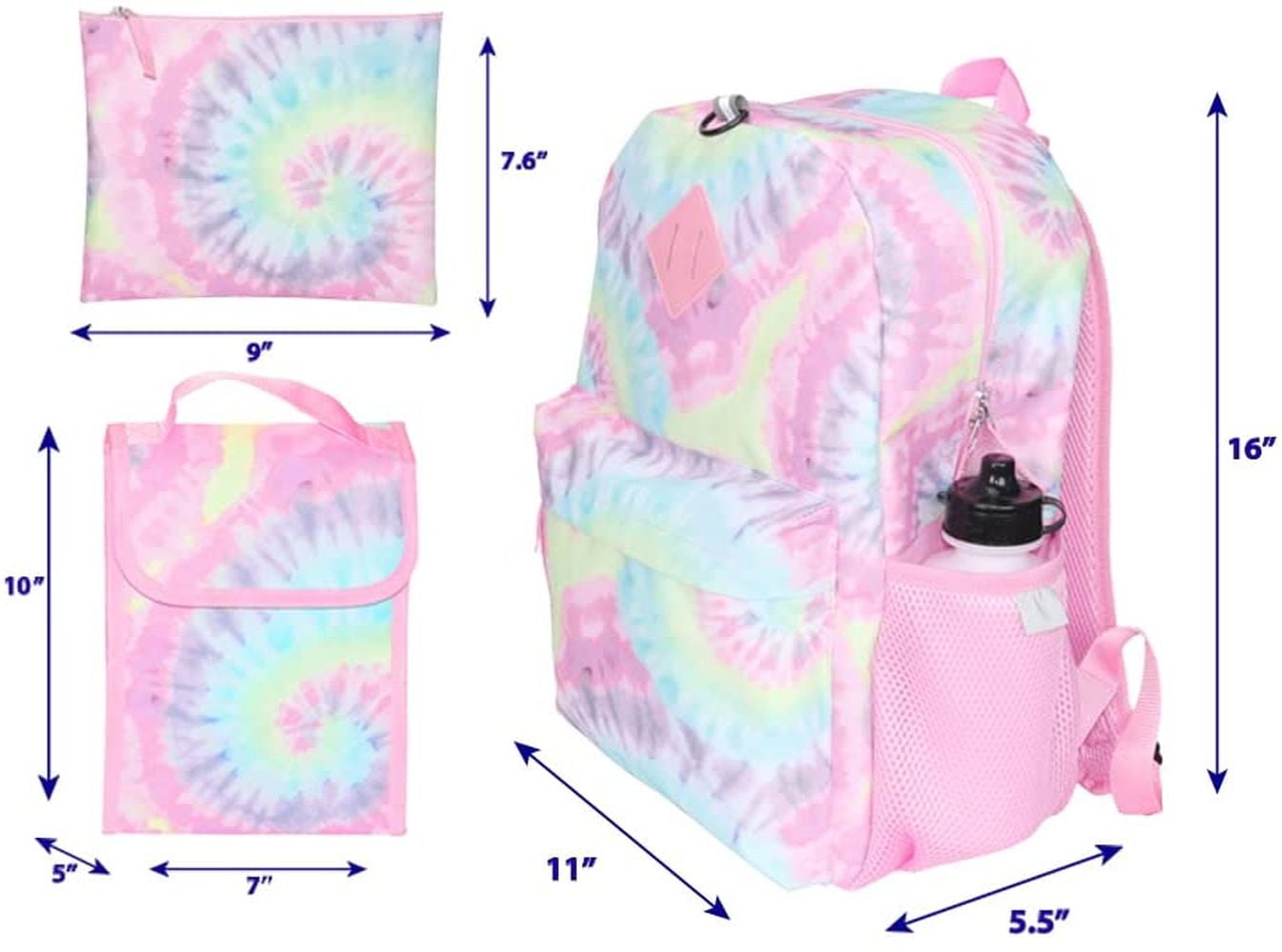 - GIRLS BACKPACK 6 PIECE BUNDLE – This pink tie-dye backpack (16 x 11 x 5.5 in.) comes with a BPA-free water bottle, a large pencil holder, a foldable tie dye lunch bag, a carabiner clip, a hair scrunchie and is ideal for girls aged 6 to 15 years. The backpack has enough space to accommodate everything she needs for school without being too heavy on her shoulders.