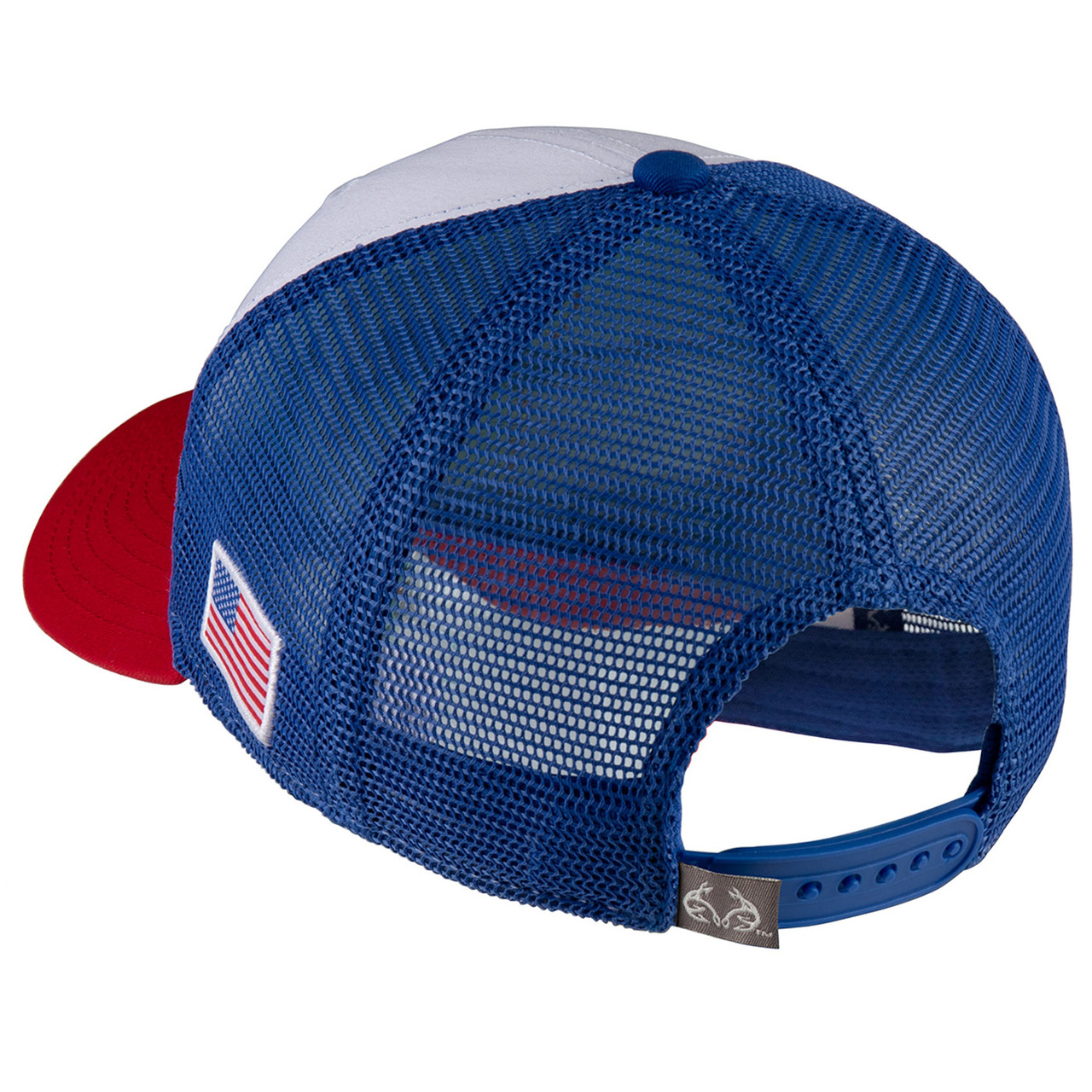 Features: Realtree Fishing AmeriBass Mesh Back Hat White Front Panel with Blue Mesh Backing and Red Visor Americana Bass on Front Patch Realtree Fishing Logo tab on Back 100% Polyester Backing Slight Pre-curved Visor Wicking Sweat Band Mid-Profile Fit White Heavy Stitching on Bill Snap Back Closure One Size Fits Most TRT15L- BK/XTRealtree Fishing Patch AmeriBass Mesh Back Hat