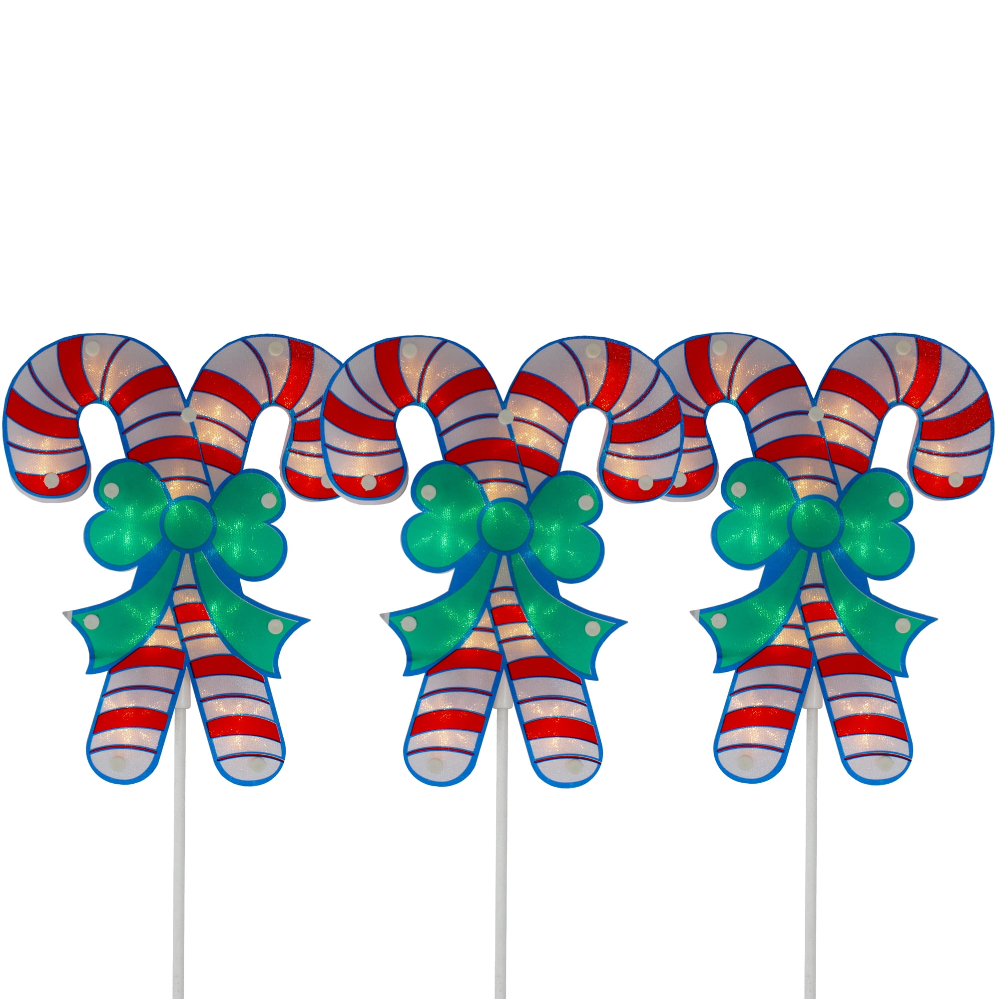 Sweeten up your holiday decor with these candy cane pathway markers. You can create your own wonderland by effortlessly adding lighting in a unique and modern way. Perfect for driveways or any area of your yard that needs a special holiday touch. Product Features: Color: clear. Number of bulbs per candy cane: 12. Number of bulbs throughout set: 36. Bulb size: mini. Spacing between each candy cane: 12". Lighted string length: 39". Total string length: 5.5′. 24" white lead cord. Additional Product Features: UL certified and approved for indoor or outdoor use. If one bulb burns out, the rest will stay lit. Contains 1 plug with end connector which allows you to stack multiple lighted items together (210-watt max). Dimensions: All Together Dimensions: 25.5"H x 8"W x 1"D. Candy Dimensions: 10"H x 8"W x 1"D. Pole Dimensions: 13.5" high. Stake Dimensions: 4" high. Material(s): plastic/wire