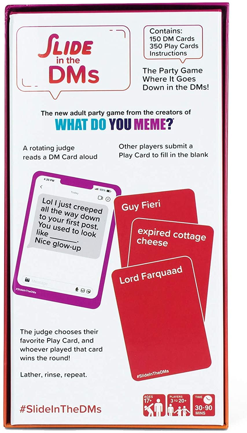 Slide in the DMs is the party game where it all goes down in the DMs! This is the BSFW, or Barely Safe for Work, edition of the title, which features toned-down content from the adults-only regular version. In this adult party game, you’ll compete to create the funniest message by pairing Play Cards to the DM Card in play each round. A rotating judge picks the winning combo! Winner gets bragging rights, and if you’re brave, the loser has to use the DM to message their crush! Slide in the DMs is the perfect way to turn game night up a notch.