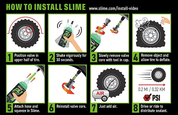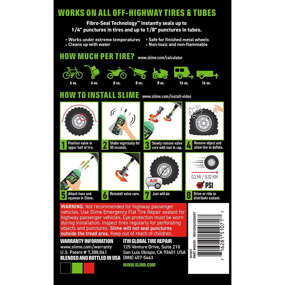 Slime’s 2-in-1 Tire & Tube Premium Sealant seeks out and instantly seals tread area punctures up to a 1/4” in tires and up to 1/8” in tubes. When a puncture occurs, Slime’s patented sealant is carried directly to the source. The pressure of the escaping air forces the particles into the opening, where they build up and intertwine to form a long-lasting, flexible plug.