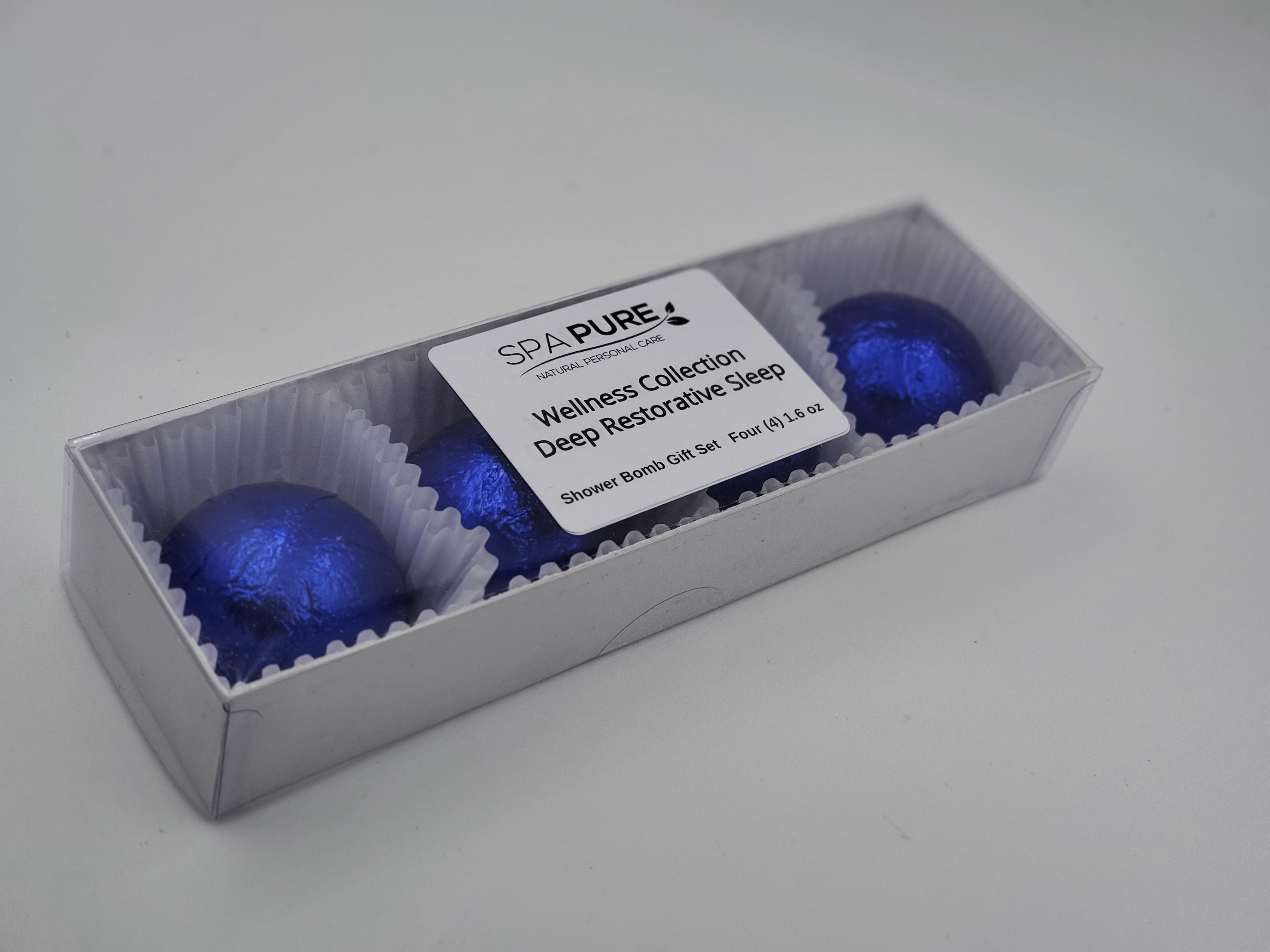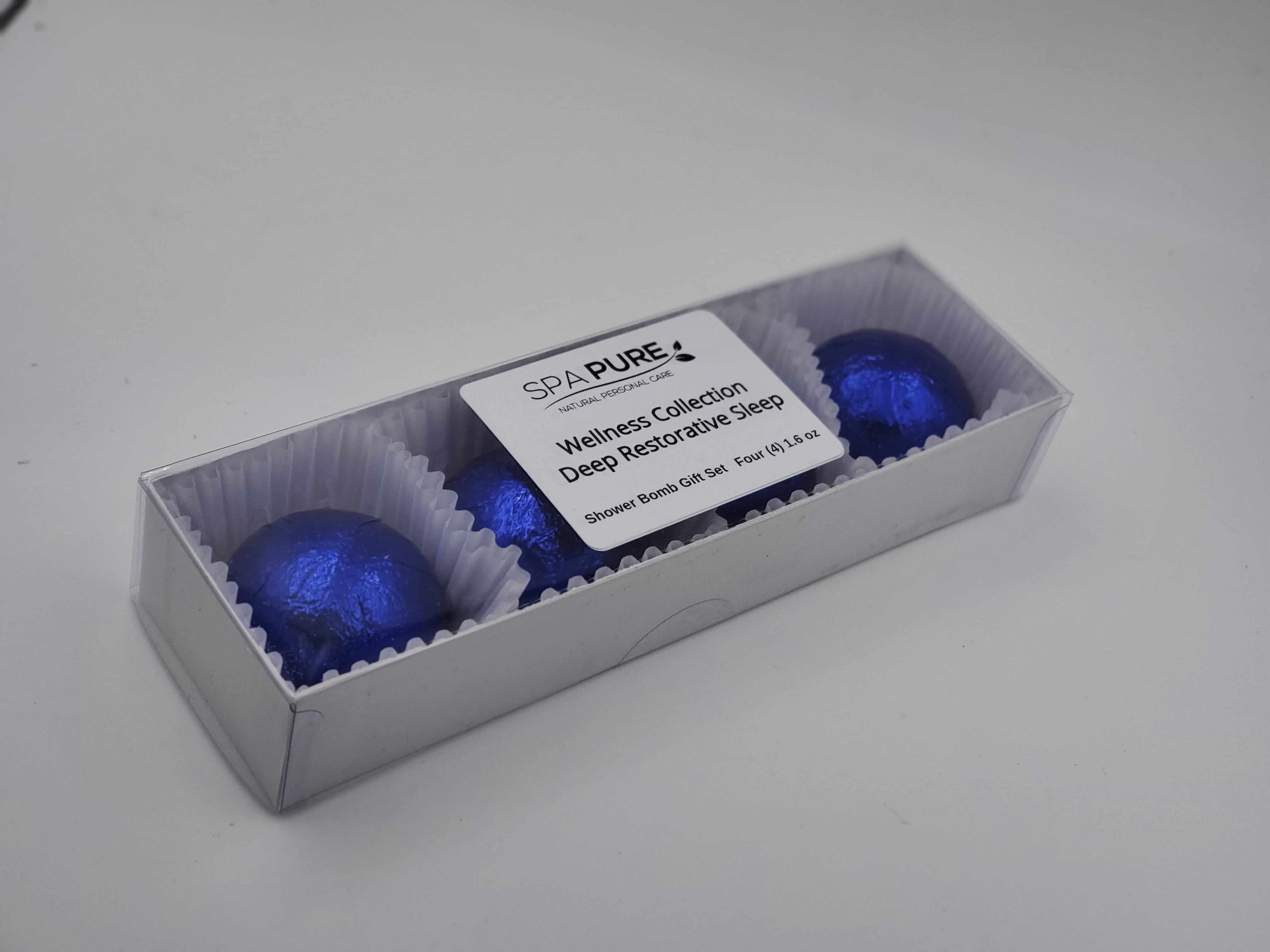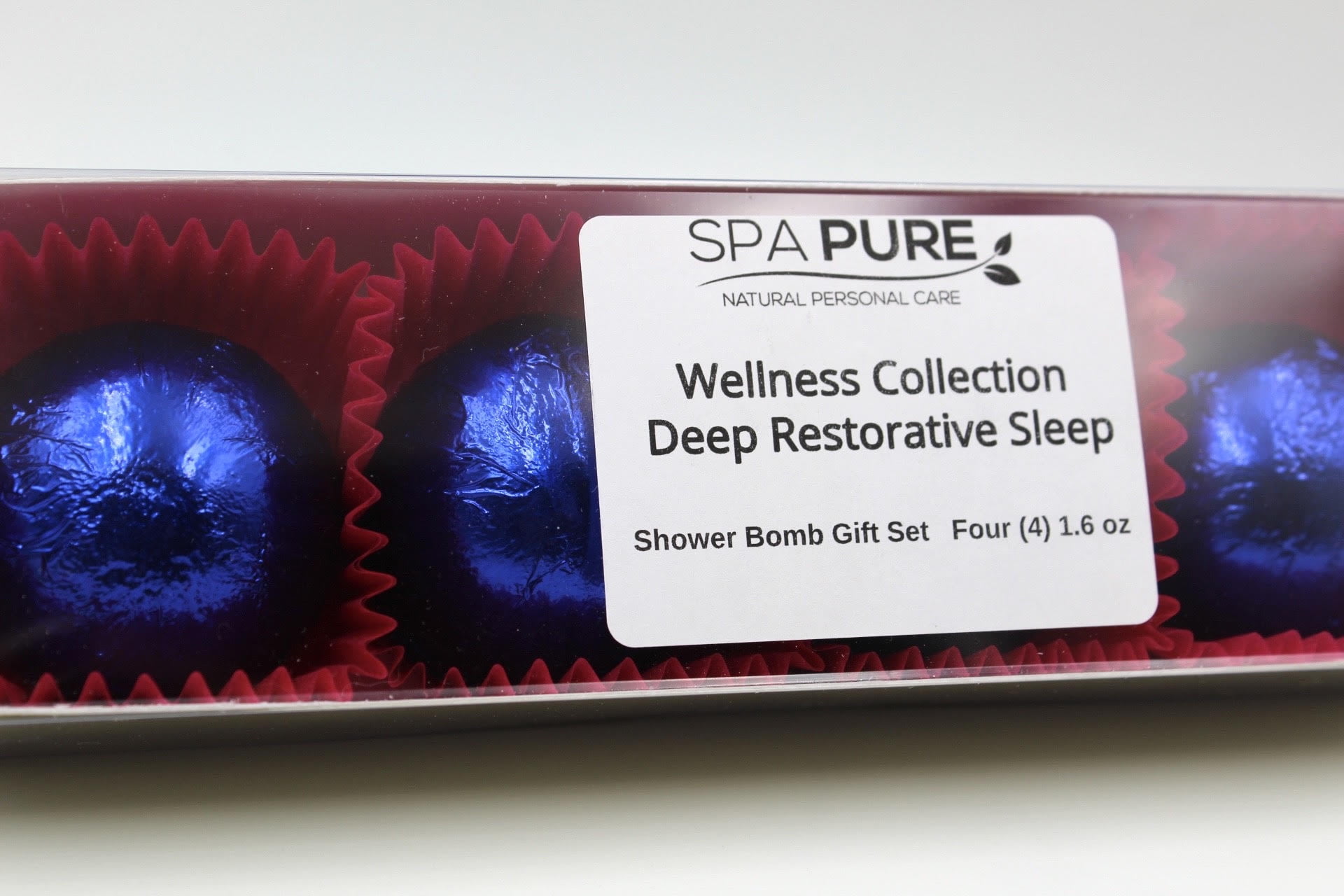 Spa Pure Deep Restorative Sleep Gift Set with 4 Shower Steamers made with essential oils. Blend of Lavender, Mandarin, Litsea Cubeba, Yuzu, Ylang-Ylang. This blend is helpful to achieve a deep sleep allowing you to wake up feeling refreshed.