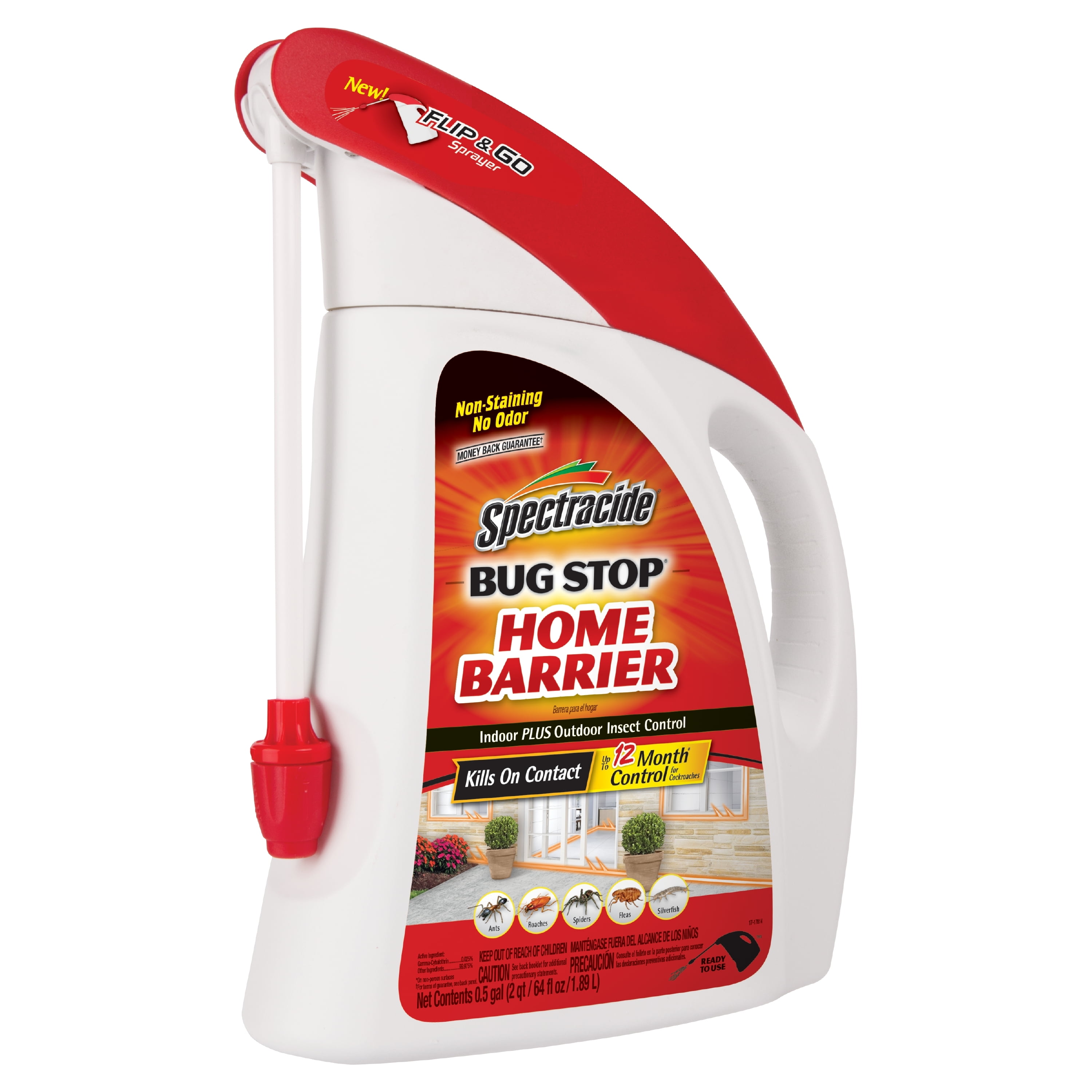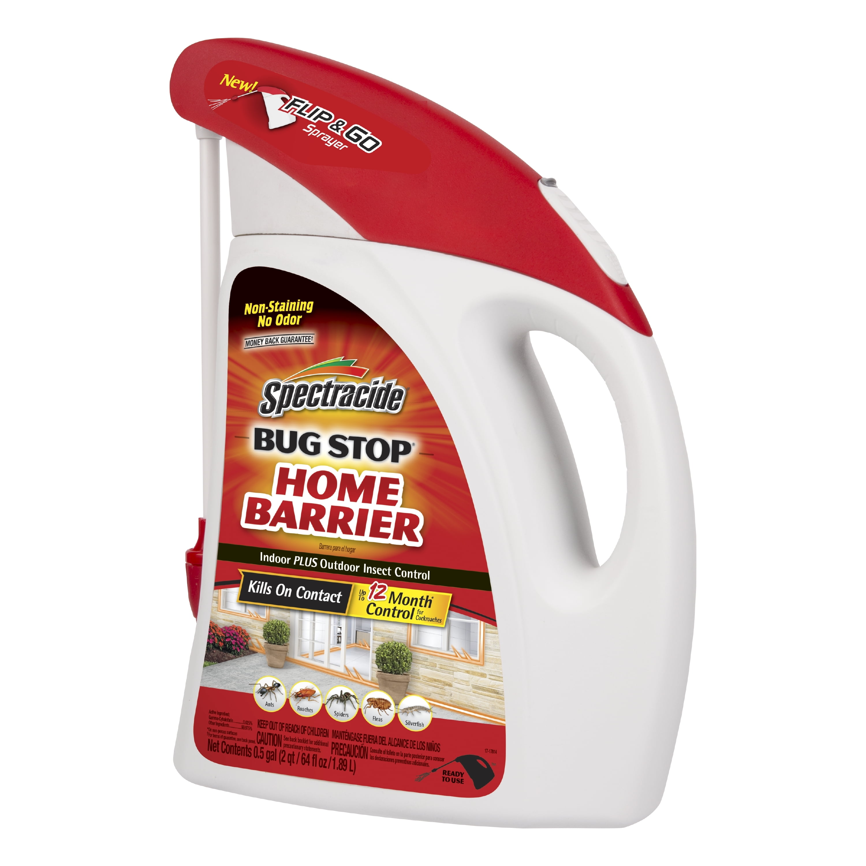 Spectracide Bug Stop Home Barrier, 0.5 Gallon, With Flip & Go Sprayer The power is in your hands to keep your landscape in line – unleash it with Spectracide lawn and garden products. Our easy-to-use insect, weed control and lawn disease solutions help you tame lawn and landscape invaders with incredible pest-punishing power. Take command with Spectracide brand. Spectracide Bug Stop Home Barrier with the Flip & Go? sprayer kills on contact to provide indoor plus outdoor insect control. This water-based, clear formula gives up to 12 months of control for cockroaches on non-porous surfaces. Use indoors and as an outdoor foundation treatment against ants, roaches, spiders, fleas, ticks, crickets, earwigs, silverfish, stink bugs and other listed insects. Leaves no odor or oily residue. The intuitive aim and spray delivery system is the ultimate in simplicity. No setup or prep needed – just flip the wand, press the trigger and start spraying to kill listed pests on contact. The precision wand allows for accurate spray. The half-gallon size makes it lightweight and easy to maneuver, as well as convenient to store in most popular storage areas. Spray inside in cracks and crevices, along baseboards, under sinks, behind stoves and refrigerators, and anywhere insects may hide. Use outside on outer surfaces of screens, door and window frames, porches, patios, buildings and wherever insects may enter, or as a perimeter treatment along your home foundation. HOME BARRIER: Indoor plus outdoor insect control. , FLIP & GO SPRAYER: Intuitive aim and spray system. Precision wand allows for accurate spray. No setup or prep needed – just flip the wand, press the trigger and spray. , KILLS ON CONTACT: Up to 12 months of control for cockroaches on non-porous surfaces – also kills ants, spiders, fleas, ticks and other listed insects. , CLEAR FORMULA: Water-based spray leaves no odor or oily residue. , 0.5 GAL: Compact size is lightweight and easy to maneuver. Easy to store in most popular storage areas.