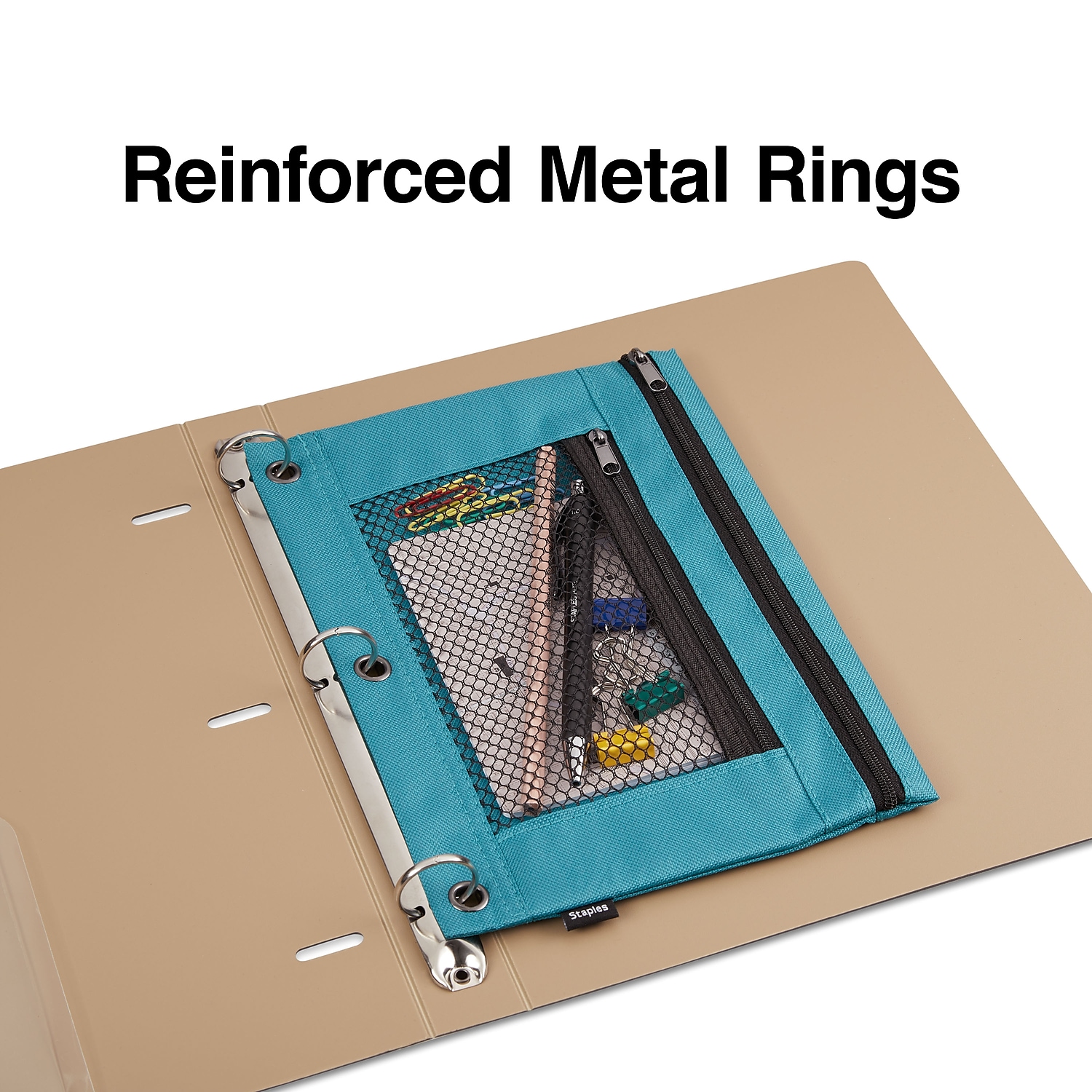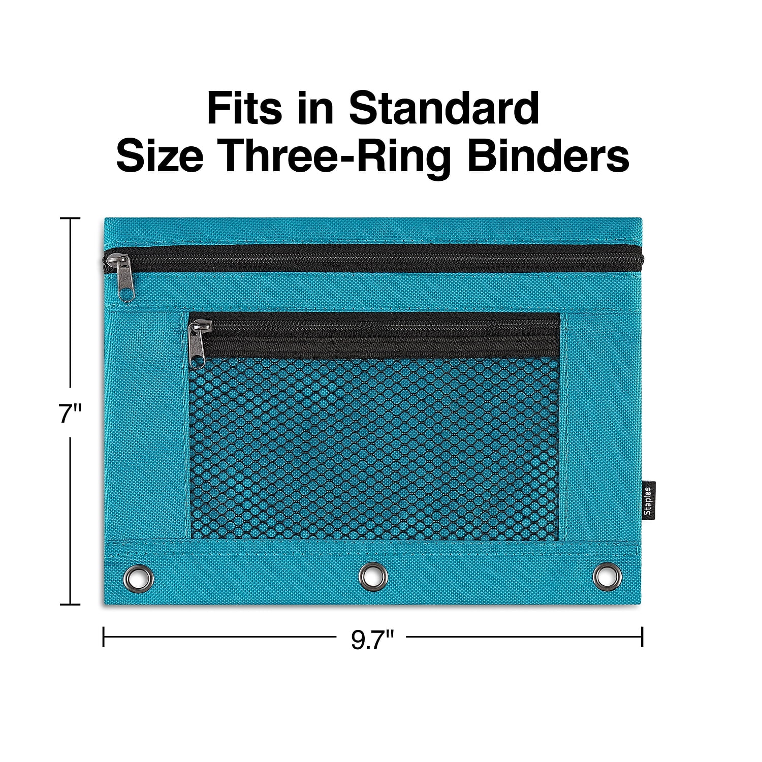 Staples pencil pouches offer durability and functionality to store and organize your writing instruments inside your binder. Please notes: The color is chosen at random, no requests.Make organization easy with Staples pencil pouches. This pouch comes in assorted colors including Blue, Purple, Red and Teal. Each pouch has a front mesh pocket allowing quick visibility to your pens and pencils. Re-inforced metal grommets keep your pouch secure in your binder, while the durable canvas shell stands up to daily wear and tear. The color is chosen at random, no requests. Single pencil pouch sold in an assortment of colors. 3 re-enforced metal rings for secure fit in binder. Smaller mesh pocket provides visibility and quick access. Assorted colors include blue, purple, red and teal. The color is chosen at random, no requests. Sold as 1 Each.
