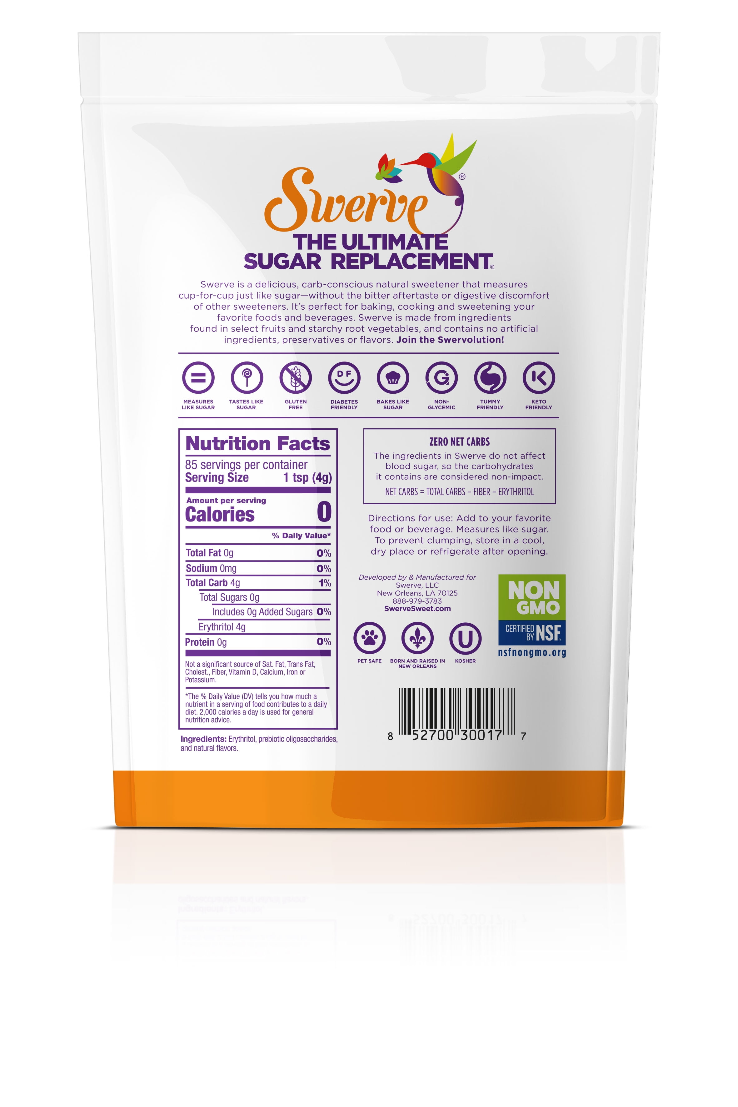 Swerve is a delicious, carb-conscious natural sweetener that measures cup-for-cup just like sugar—without the bitter aftertaste or digestive discomfort of other sweeteners. It’s perfect for baking, cooking and sweetening your favorite foods and beverages. Swerve is made from ingredients found in select fruits and starchy root vegetables, and contains no artificial ingredients, preservatives or flavors. Join the Swervolution!