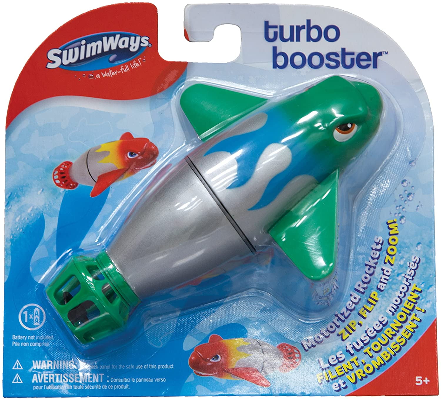 The SwimWays Turbo Booster motorized pool toy zips, flips and races on the water’s surface. Kids will love watching where their speedy rocket friend will swim next. Simply twist and turn his middle to engage the battery and launch the rocket. Features simple pop-open battery installation – no tools required! Requires 1 x AA battery (not included). Sold individually. Colors may vary. Ages 5+.