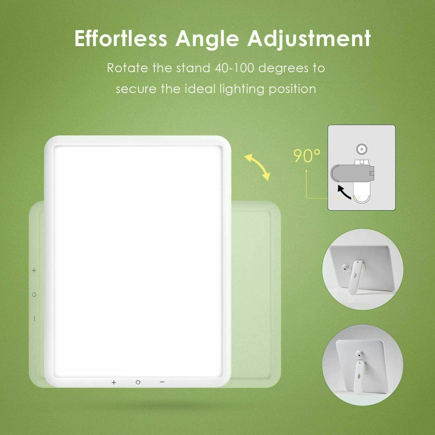 Features: 1. Create a Sunny Window Indoors: Mimics the full spectrum of light found in daylight, UV-free LED shines with a 10,000 lux intensity to bring 6500K light to help fight winter blues, jet lag, shift work & seasonal changes 2. Ultra-Thin Design: Lightweight & unobtrusive 0.39in profile is super portable, simply slip into the supplied protective storage bag & away you go 3. Rotatable Stand: Pivot the stand 90 degrees for use in portrait or landscape & adjust the opening angle between 40-100 degrees to position the light as best needed 4. Smooth Dimming: Simply touch the “+ “or the “–“ button for 2 seconds to set your ideal dosage & reap the mood-boosting benefits the light brings 5. Easy-Set Timer: Long press the power button to start the 30min timer, LED indicator blinks white upon successful activation, long press a second time to cancel the timerTaoTronics Light Therapy Lamp 10000 Lux Brightness Adjust Timer & Memory LED39