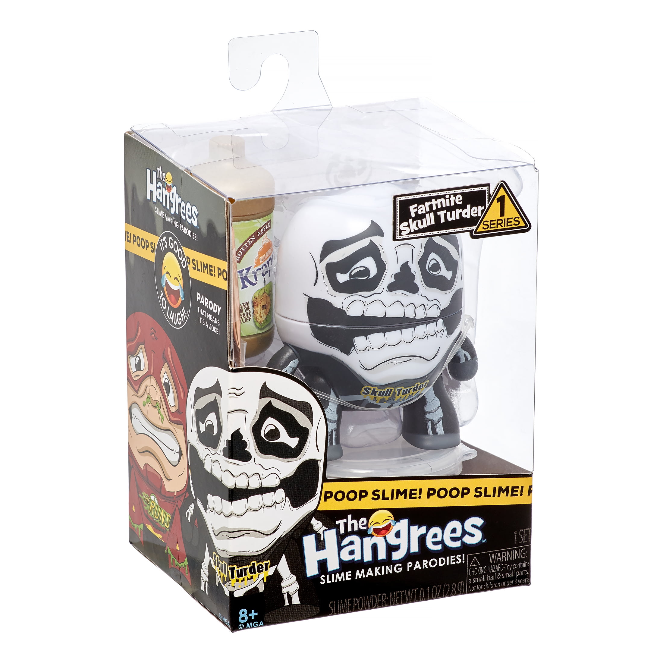 Welcome to the warped world of The Hangrees! These outrageous, collectible pop culture parody figures are hungry â FEED them their favorite parody food, drinks and snacks. Then SHAKE âem up to make them POOP a variety of mystery slime poop! Itâs Good to Laugh! with parodies of kidsâ favorite movies, video games, snacks and more! Collect them all â and look for the special rare âmetallicâ characters, too! Ages 8+Hangrees- Fartnite Skull Turder
