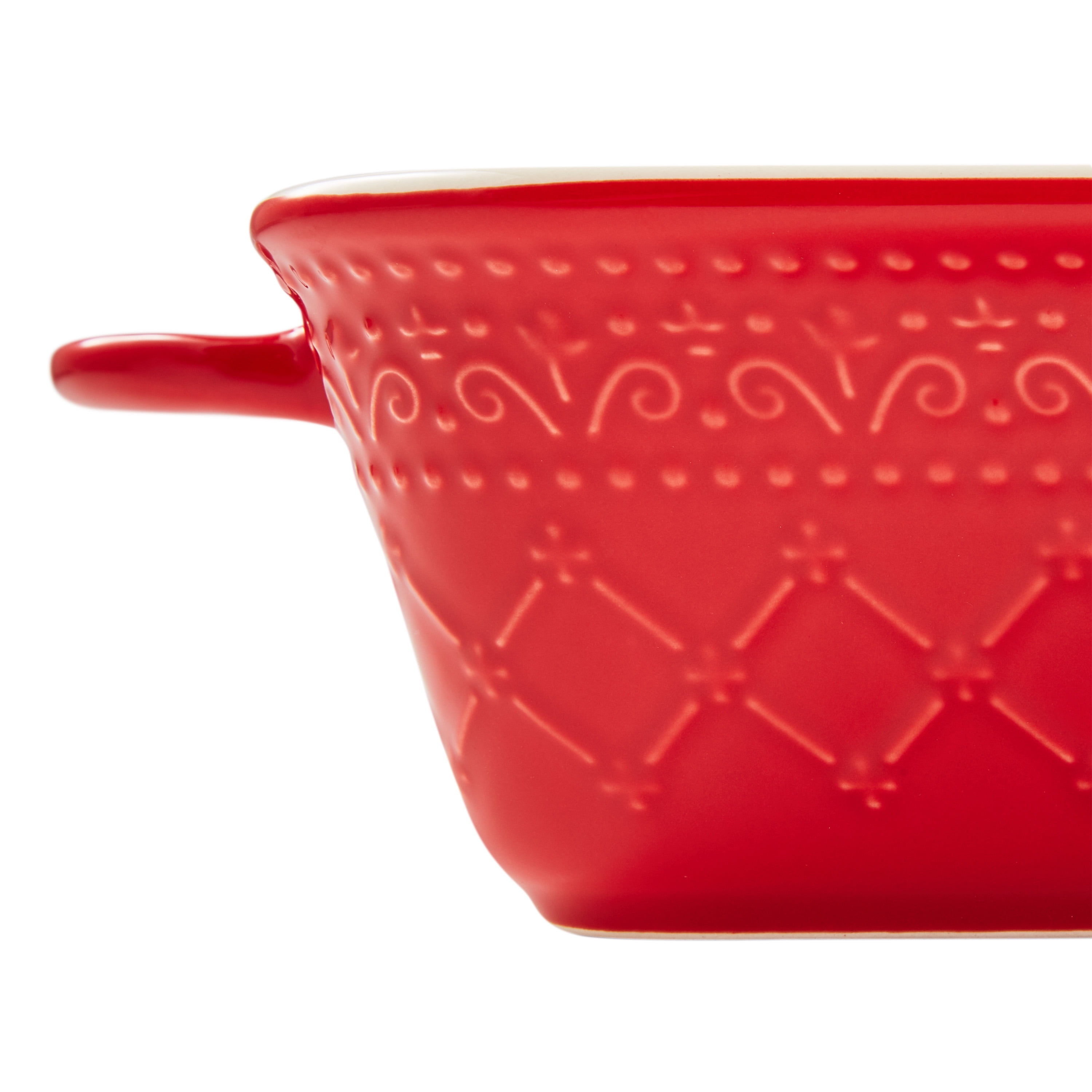 - Includes 1 larger baker with handles in a bold red color and 1 smaller baker with handles in a charming teal color