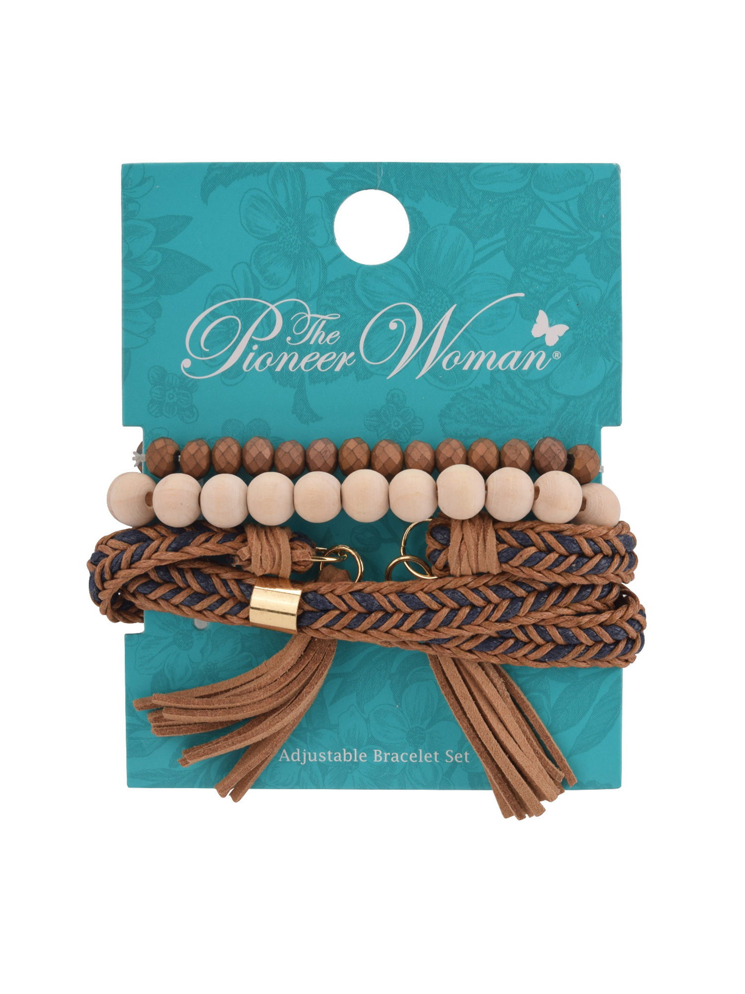 The Pioneer Woman – Adjustable bracelet set will make a great addition to your every day fashion jewelry collection. This set includes two wood bead stretch bracelets and one woven faux suede tassel adjustable wrap bracelet. The set has a beautiful accent of worn gold finish.
