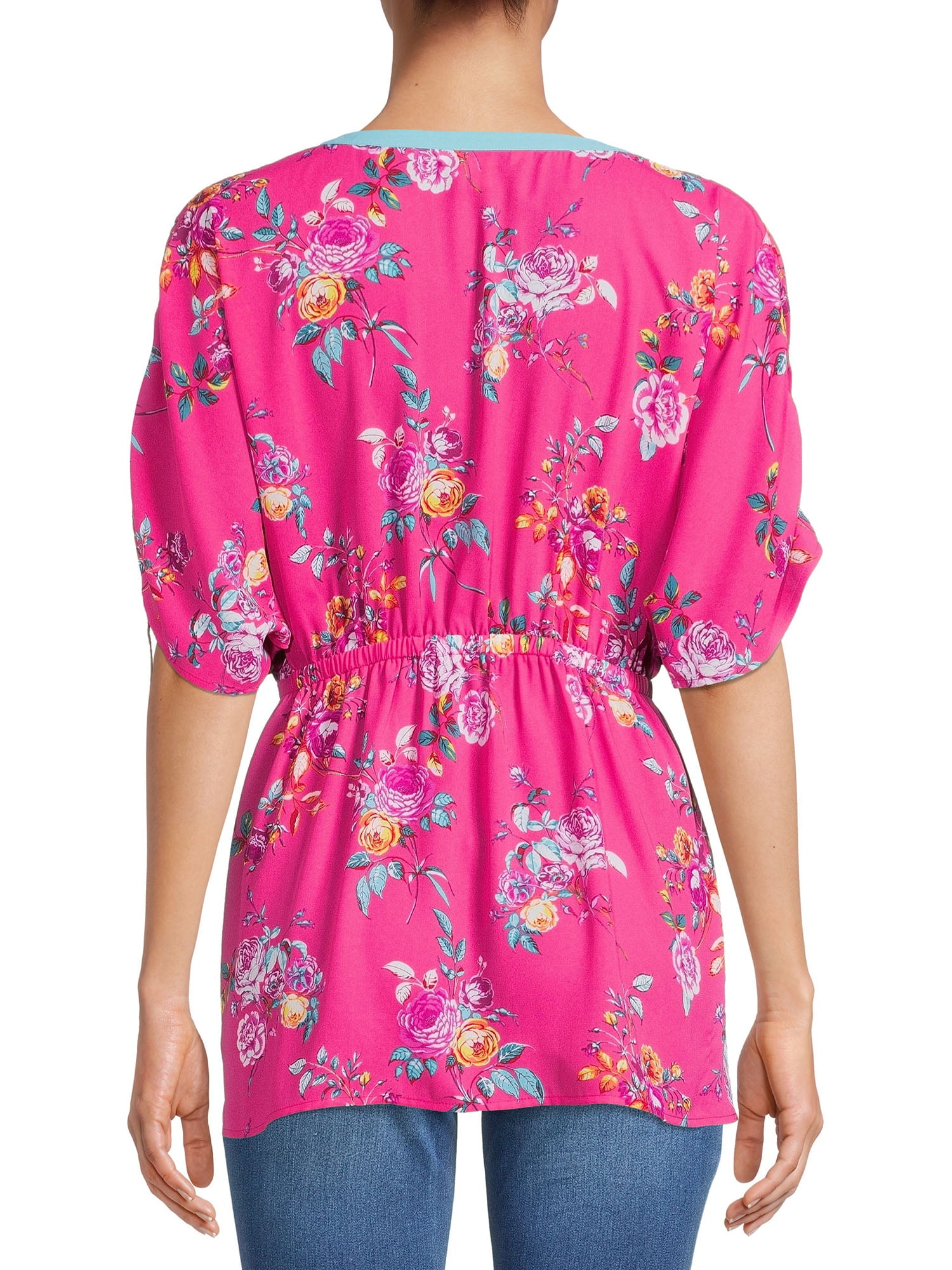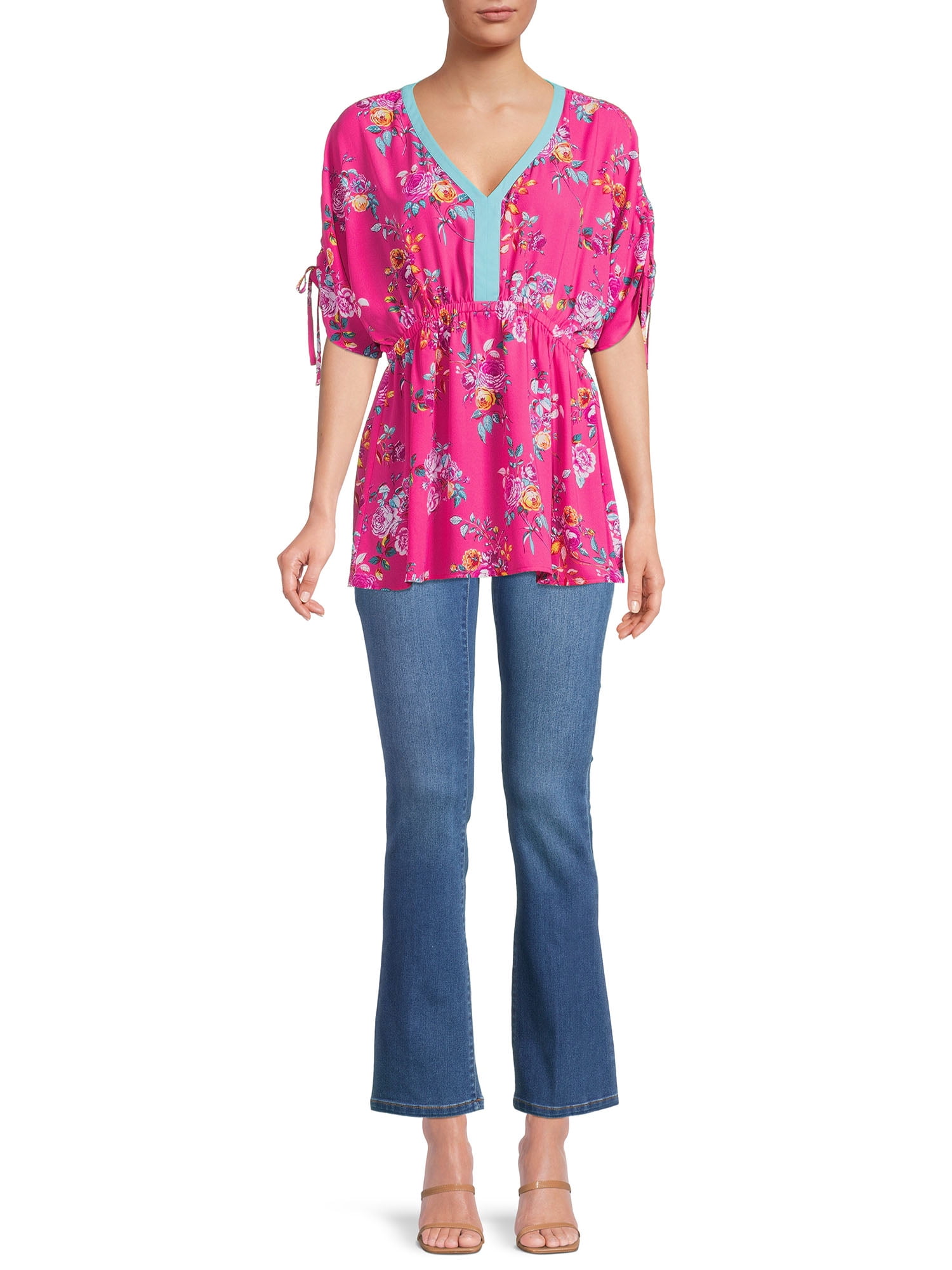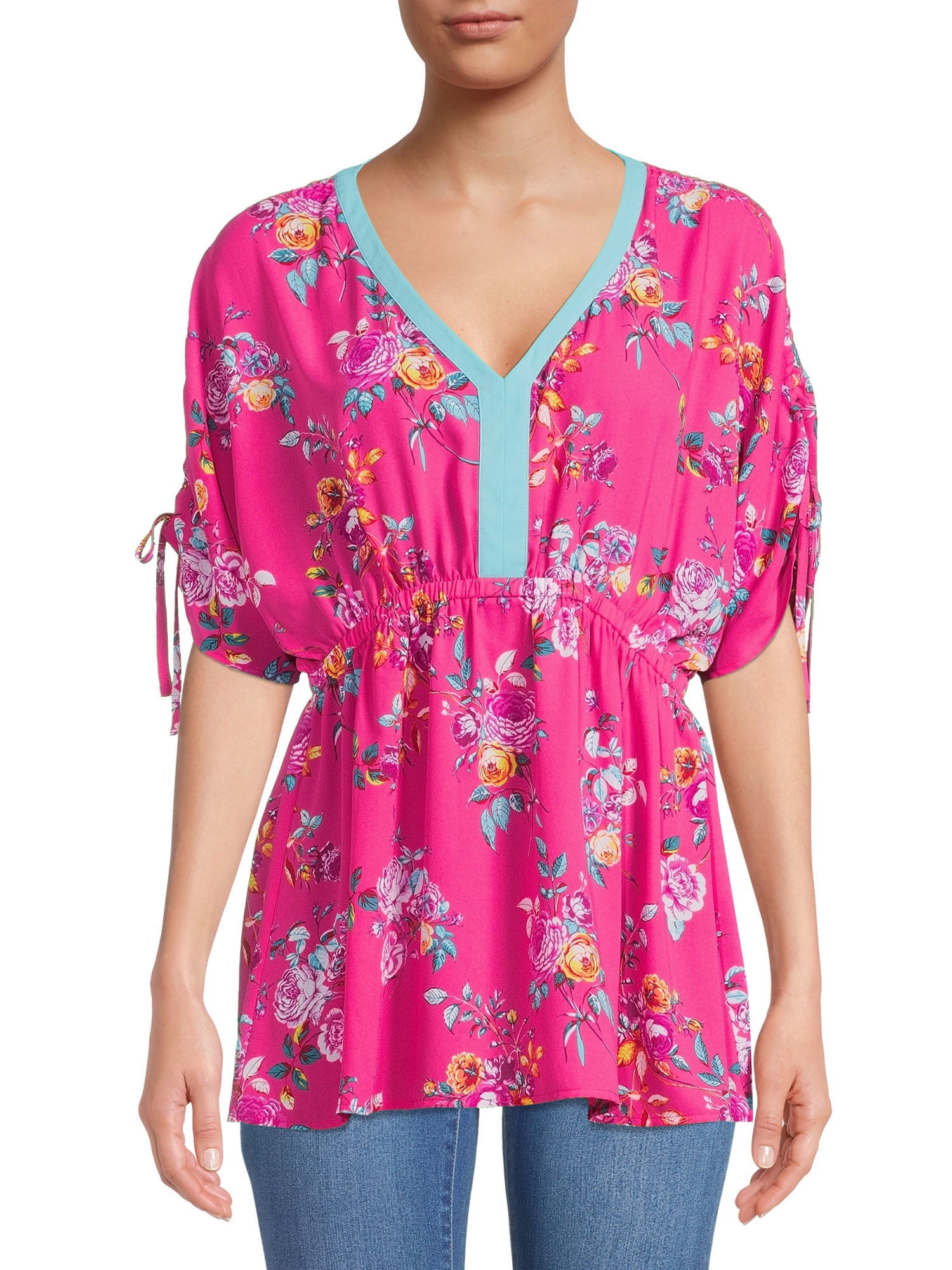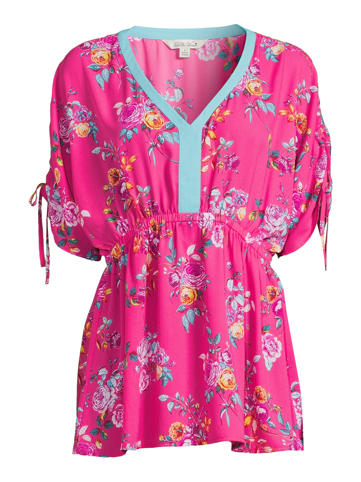 Turn heads with this tunic length top with dolman sleeves by The Pioneer Woman. The textured crepe fabric is made with a gorgeous allover print that will have you reaching for this top again and again. The top features a contrast ribbon at the neckline and self ties at the sleeve for a bit of unexpected detail that only adds to the beauty of this top. Exclusively at Walmart.