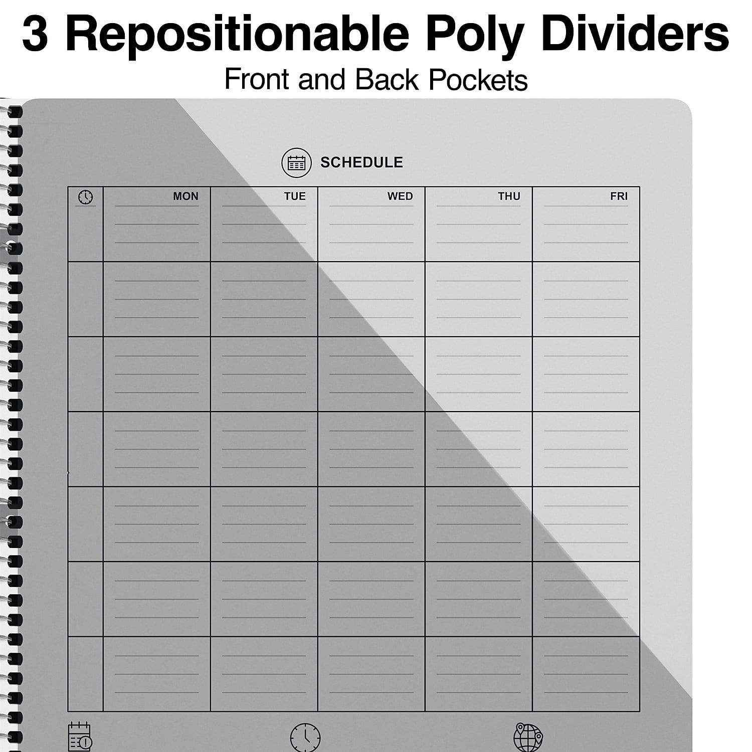 - 150 sheets of college-ruled paper for efficient use of space. Three pocket dividers.
