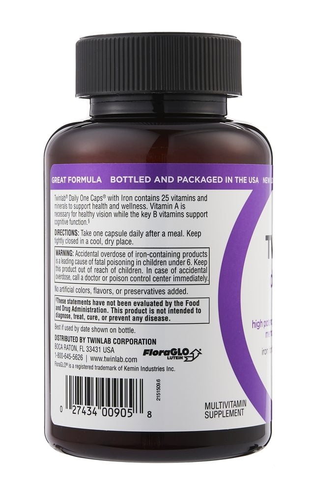 Twinlab Daily One Capsules with Iron contain a blend of 26 nutrients including FloraGlo lutein, a powerful antioxidant associated with eye health and extra folic acid to help support a healthy heart. One capsule is all you need to get 100% or more of the daily requirements for 19 important vitamins and minerals.