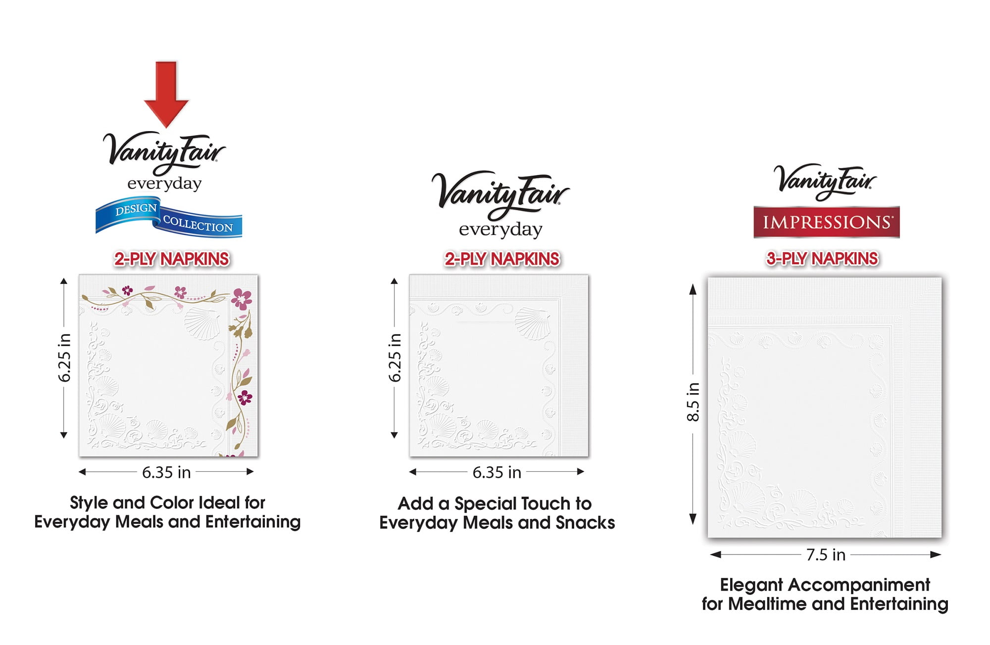 Soft and strong with a cloth-like texture, these Vanity Fair Beverage Napkins are from the Everyday Design Collection. These premium paper products combine the softness and quality you expect from the brand with attractive print designs to add a special touch to any meal or moment. These two-ply Vanity Fair dinner napkins are perfect for any meal. They’re 50 percent larger than the regular ones so they’re ideal for entertaining. Add a colorful, special touch to everyday meals and snacks with this set. These everyday napkins are thick and absorbent and embossed with a stylish Monterrey shell design. Wild honey and mantilla lace prints dress them up in a lovely way.