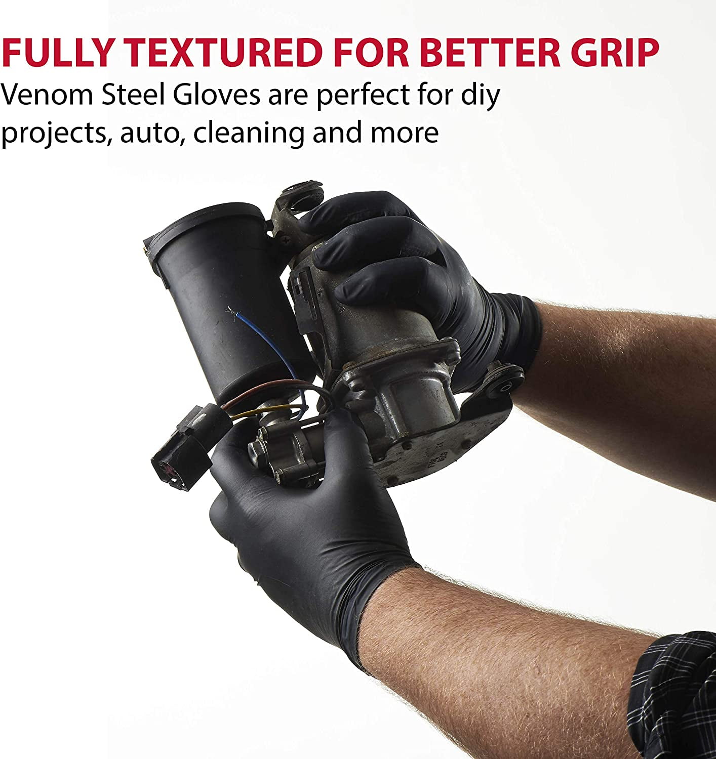Great for automotive, marine, mechanical, construction, janitorial, plumbing, painting and moreVenom Steel Industrial Nitrile Gloves, 6 mil, 2 Layer Rip Resistant, One Size Fits Most, 100 Count