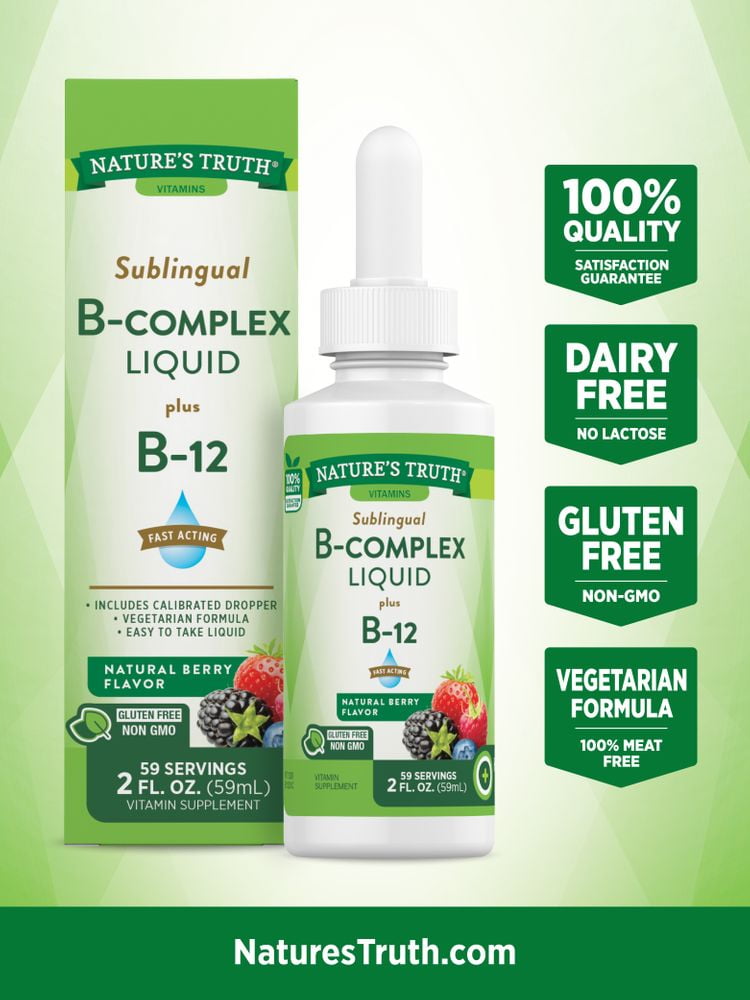 Supplementing with B-Vitamins: There are eight B vitamins collectively called B complex vitamins. This includes thiamine (B-1), riboflavin (B-2), niacin (B-3), pantothenic acid (B-5), pyridoxine (B-6), biotin (B-7), folate (B-9) and cobalamin (B-12). B Vitamins are naturally present in foods like Whole Grains, Red Meat and Dairy; however, many people turn to supplements as an additional source of support. How to get B-Vitamins: B-Vitamins are typically found in products such as Pills, Gummies, Liquid, Powder and Chewable Tablets. A valuable B-Vitamin Complex comes from a professional source backed by years of experience and expertise. Why choose Nature’s Truth’s Vitamins? Nature’s Truth’s B Complex Liquid: Nature’s Truth’s B Complex Liquid is an advanced Sublingual Formula scientifically-designed for Men & Women. It features beneficial nutrients like Vitamin B2, B6, B12 and Niacin in a delicious natural berry flavored Fast-Acting Liquid. Purity and potency are our top priorities at Nature’s Truth, which is why our formula is Non-GMO, Gluten-Free and contains no Artificial Flavor.