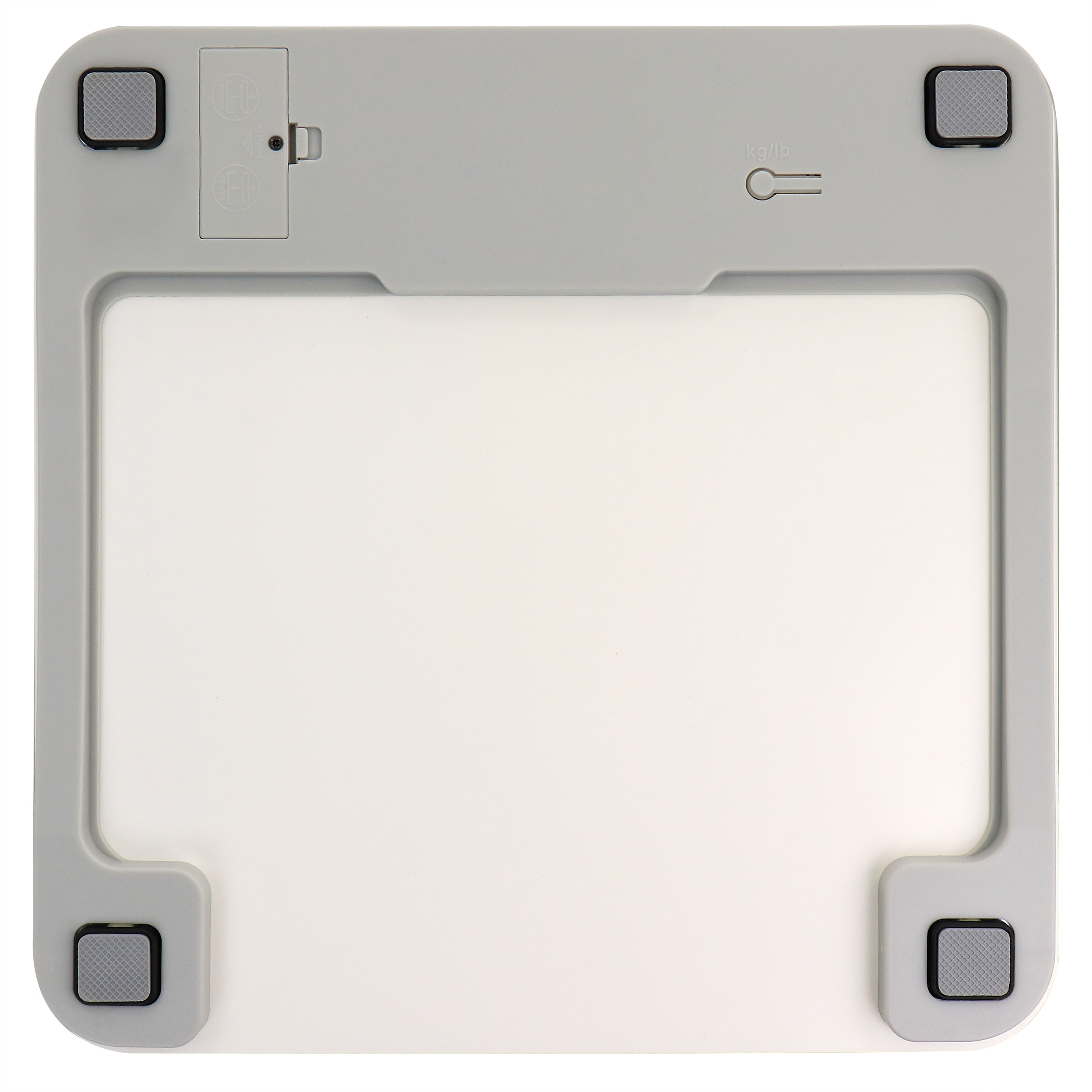 Material: Tempered Safety Glass Color: Off-White Extra-large 2" LCD display is easy to read 400 lb. weight capacity 0.1 lb. increments Requires 1 CR 2032 battery (included) Includes: One scale, one CR2032 battery, and one manual Item Measurements: 12.6in length, 12.5in width, 0.7in height, 3.75lb weight