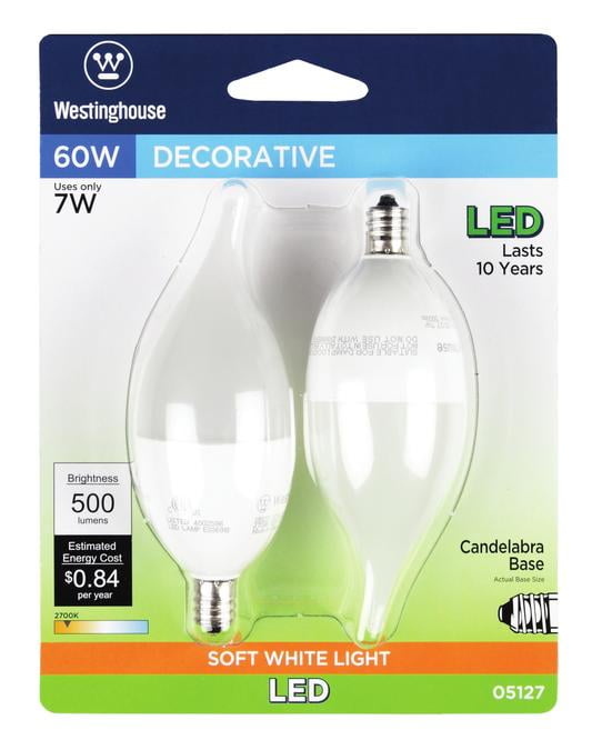 Features: -7 W replaces 60 W incandescent bulb. -Eco-friendly. -Bulb life of 10 years (12,000 average rated hours) is longer than conventional lighting. -Instant-on flame tip C13 LED. -LED contains no harmful mercury. -Perfect for use in chandeliers, fans, sconces to outdoor porch and post lanterns. Application: -Household/General purpose. Wattage: -7 Watts. Voltage: -120 Volts. Shatter Resistant: -Yes. Color Temperature: -2700 Kelvin. Bulb Base: -E12/Candelabra. Bulb Shape: -C13. Bulb Color: -White. Bulb Type: -LED. Energy Efficient: -Yes. Total Number of Bulbs: -1. Dimensions: Bulb Diameter: -1.61". Overall Product Weight: -0.18 lbs. Overall Height – Top to Bottom: -6.77". Specifications: Commercial ONLY Certifications: -Yes. Commercial OR Residential Certifications: -Yes.WL4446