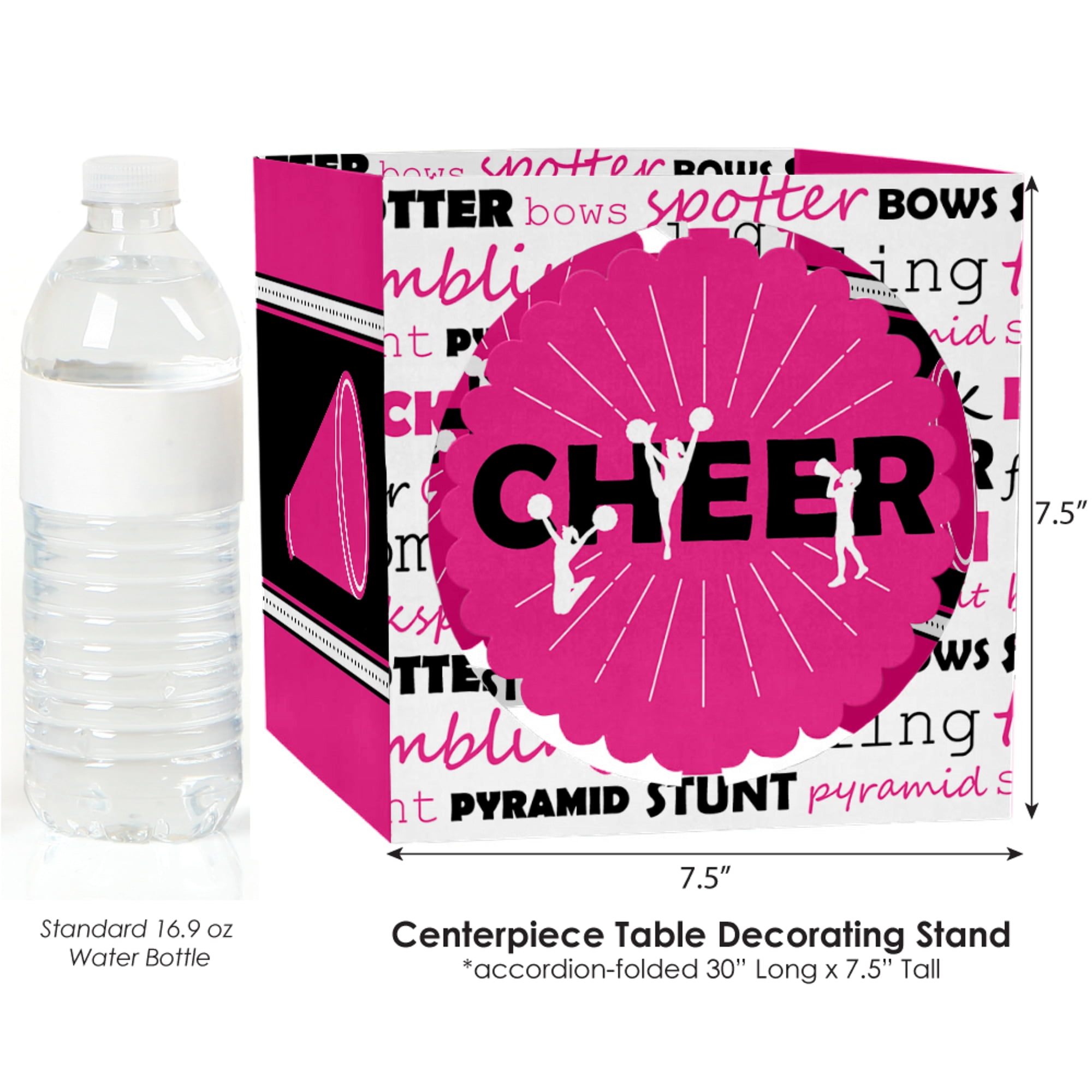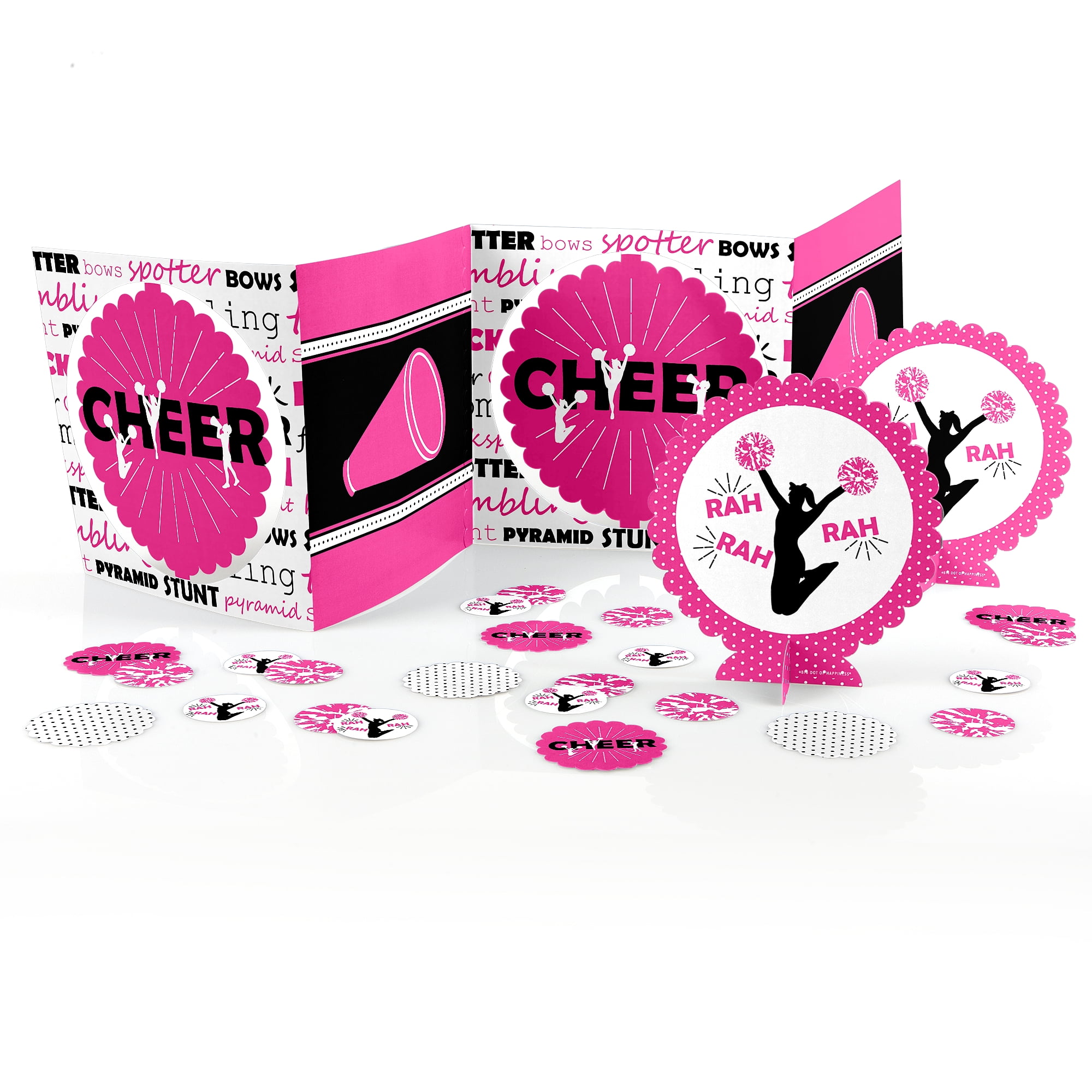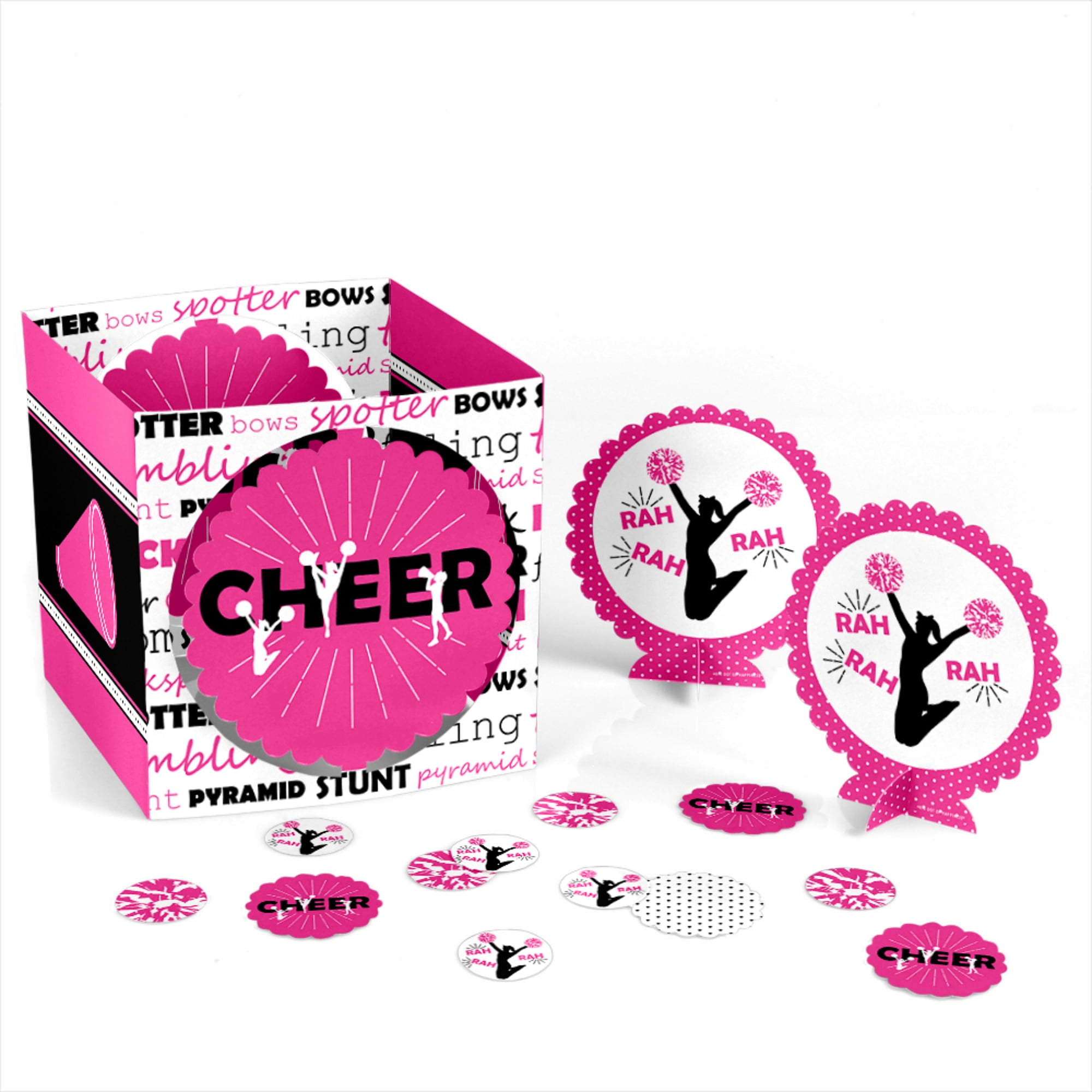 - Cheerleading party decoration kit SIZE 1 Accordion-Folded Centerpiece (may also be formed into a cube using the included stickers), 30" long x 7.5" tall; 2 Scalloped Centerpiece Stands, 5.5" wide x 5.75" tall; 12 Scalloped Table Confetti Circles, 2.5" diameter; and 24 Round Table Confetti Circles, 1.5" diameter. The unique design and variety of pieces makes this We’ve Got Spirit – Cheerleading party decoration kit an impressive addition to any baby shower or birthday party.