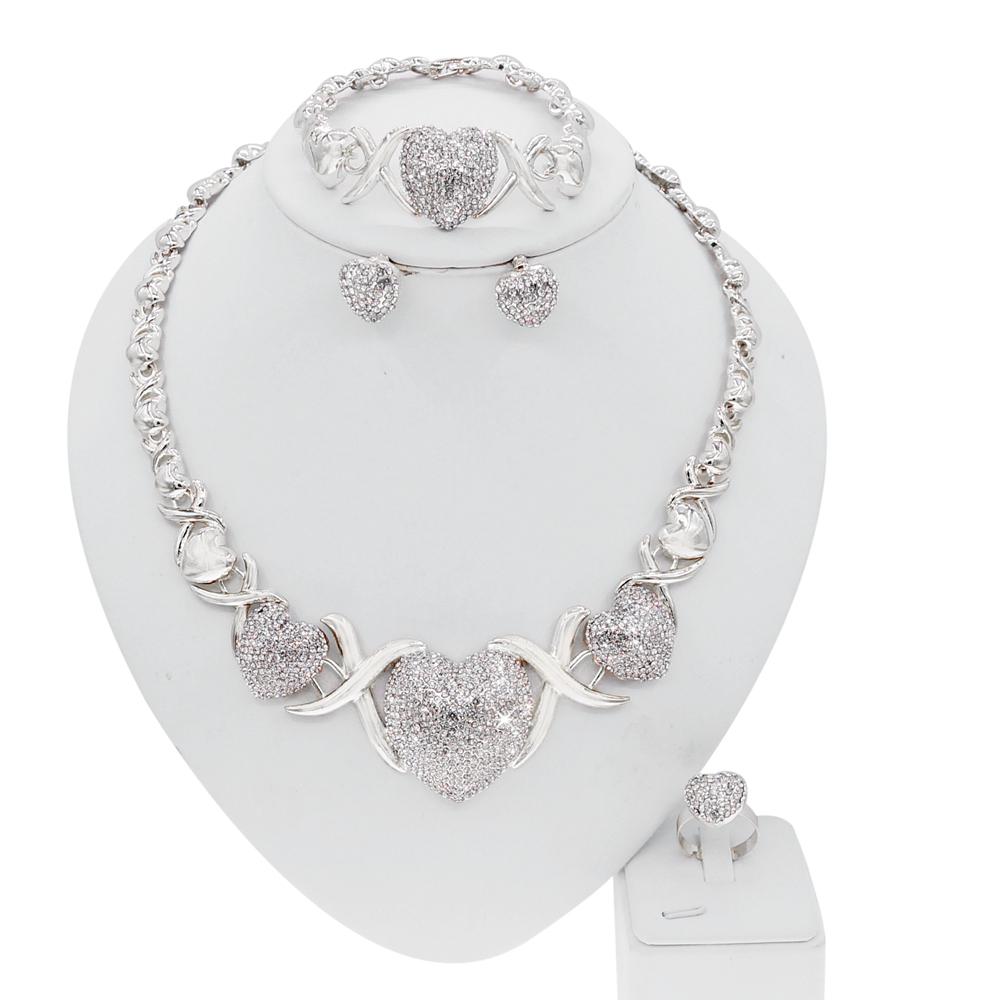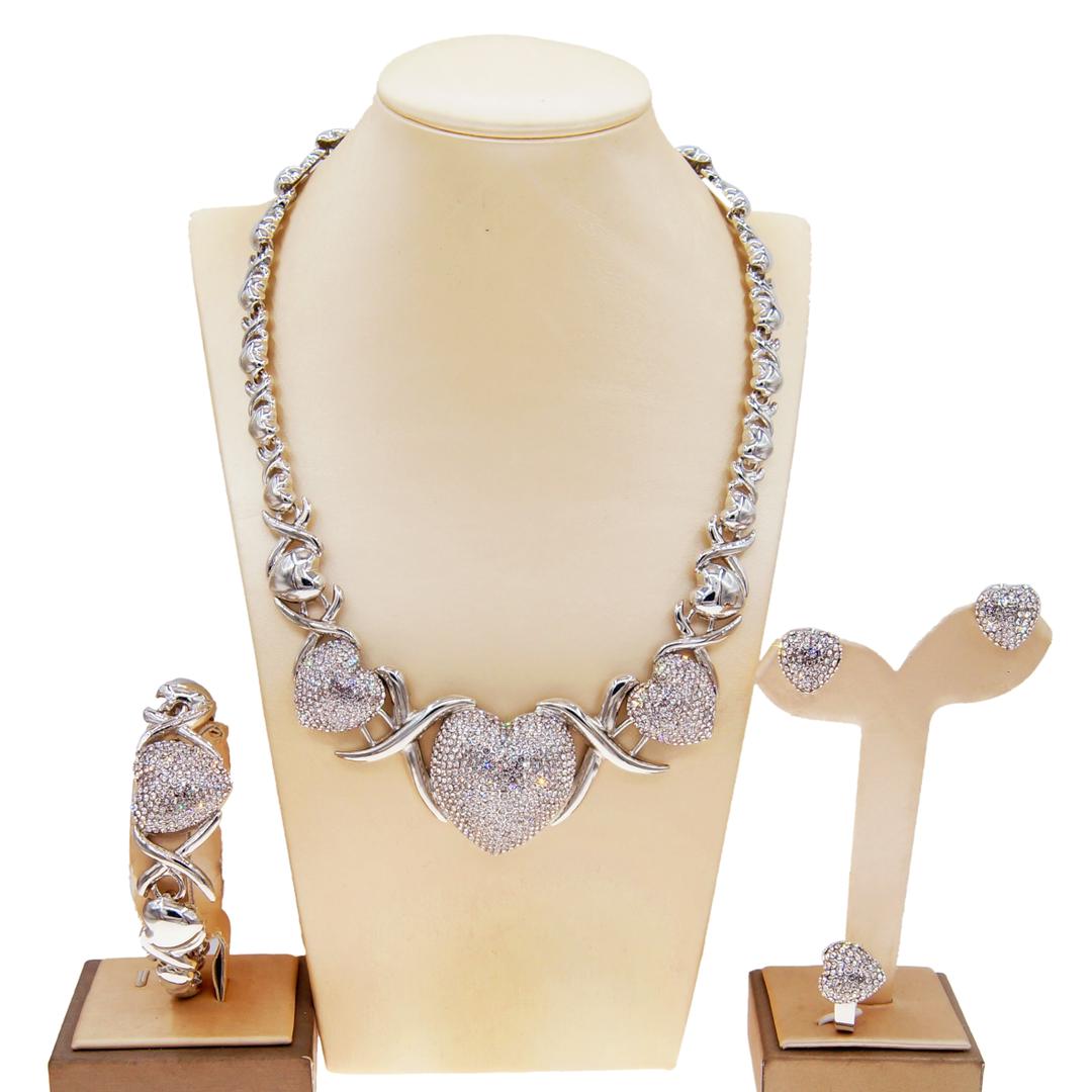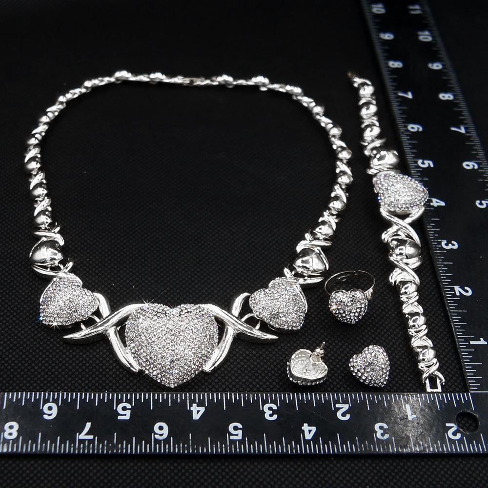 - Style : Real Looking Diamond Big Heart Charm Necklace , As Well As Bracelet . Ring – Heart Shaped Real Looking Diamond . Earrings – Heard Shaped Push back clasp.