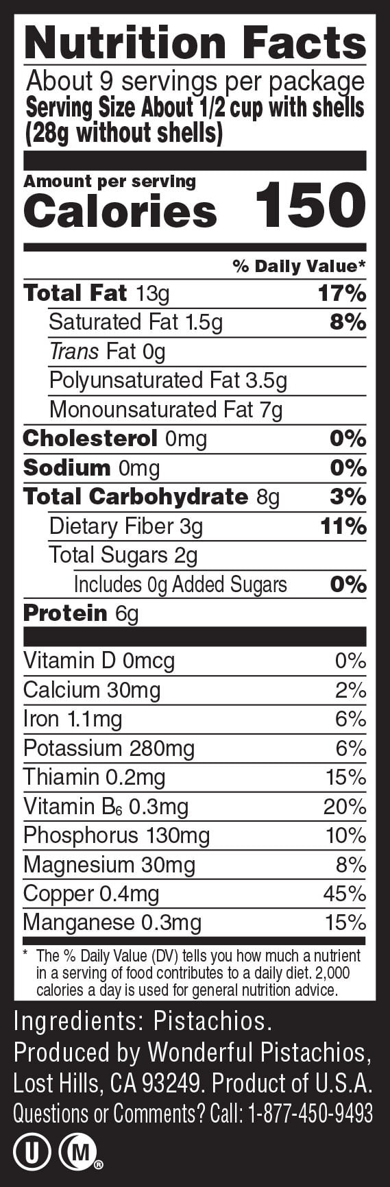 One 16 Ounce Resealable Pouch of our Roasted In-Shell Wonderful Pistachios with No Salt. Wonderful Pistachios are a smart, healthy choice for folks around the world. Located in California?s fertile San Joaquin Valley, Wonderful Pistachios & Almonds owns, cultivates and harvests more than 75,000 acres of pistachio and almond orchards, and delivers pounds of nuts globally each year. The warm days and cool nights work in harmony with the region?s natural soils to create the perfect growing climate. We then carefully tend and harvest each pistachio using the latest in sustainable practices.One 16 Ounce Resealable Pouch of our Roasted In-Shell Wonderful Pistachios with No Salt.