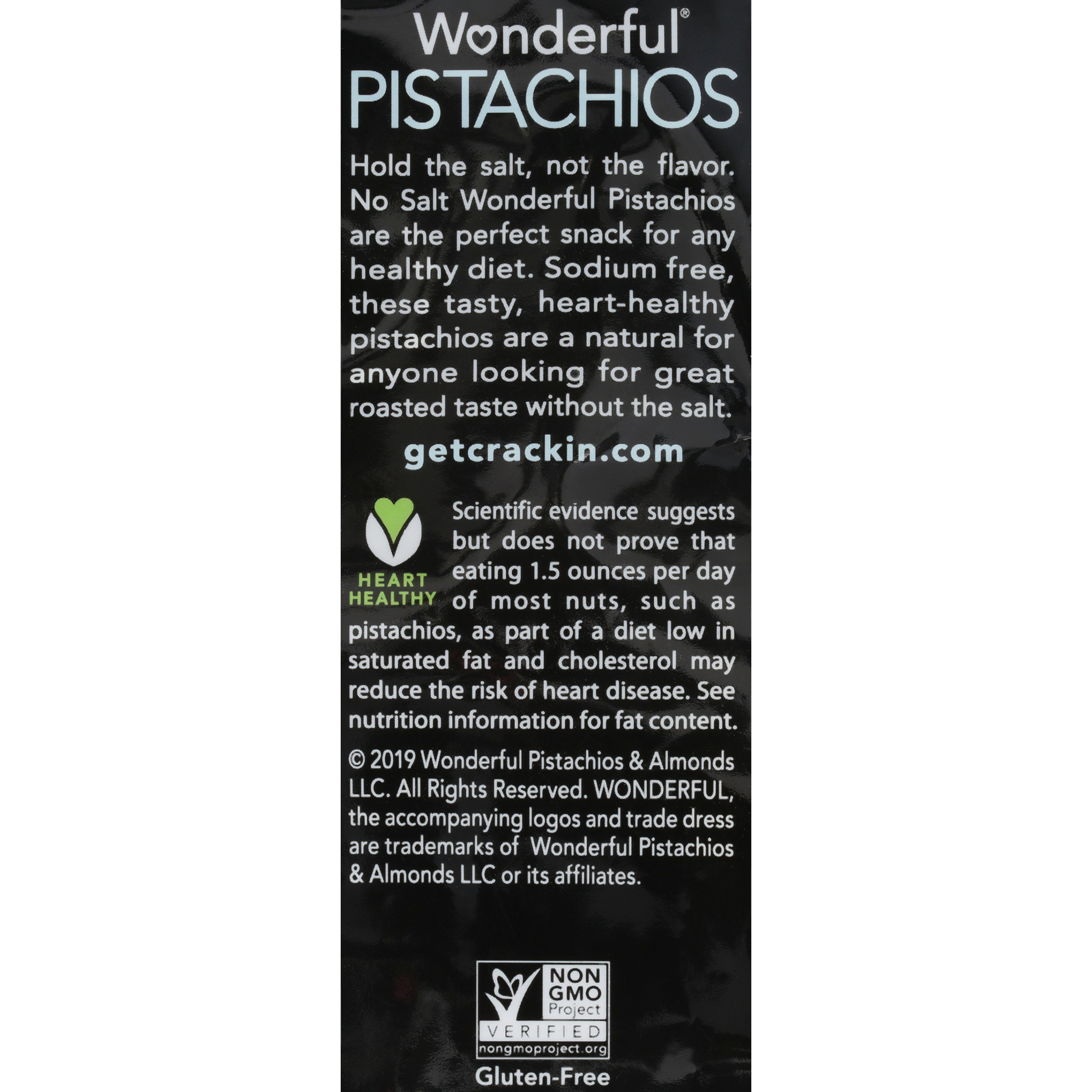 - Hold the salt, not the flavor. No Salt Wonderful Pistachios are the perfect snack for any healthy diet. Sodium free, these tasty, heart-healthy pistachios are a natural for anyone looking for great roasted taste without the salt.*