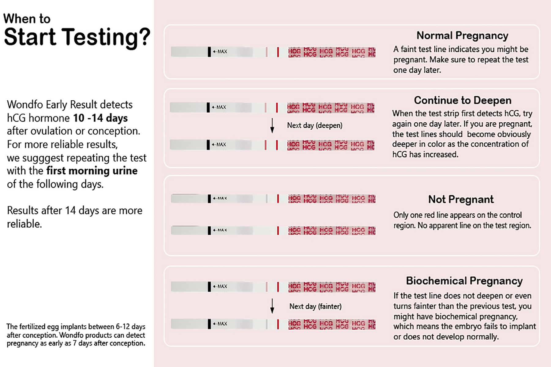 - When to Start Testing – Wondfo Early Result detects hCG hormone 10 – 14 days after ovulation or conception. For more reliable results, we suggest repeating the test with first-morning urine of the following days. Results after 14 days are more reliable.