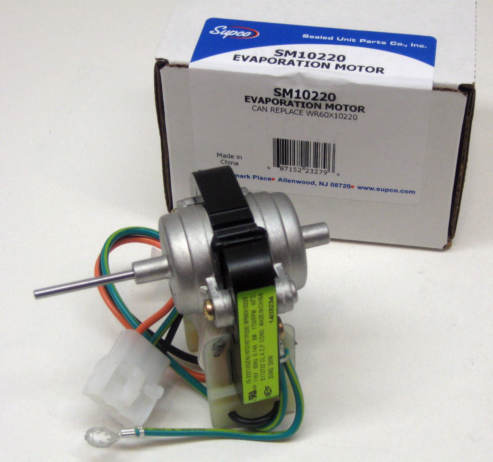 SUPCO part number SM10220 for Whirlpool.It is rated at 115V 60Hz 0.14A 9W 1750RPM.This motor has 3 pin plastic plug attached to it plus a Ground Wire with a ring connector.Motor mounts at the bottom rear of the refrigerator near the compressor.Shaft is 1/8" diameter x 1-3/4" long.Replacement for numbers WR60X10220, IS-23213GEN, 197D1871P026, AP4298602 and PS1766247.This fits specific General Electric manufactured Refrigerator models including Hotpoint and RCA.