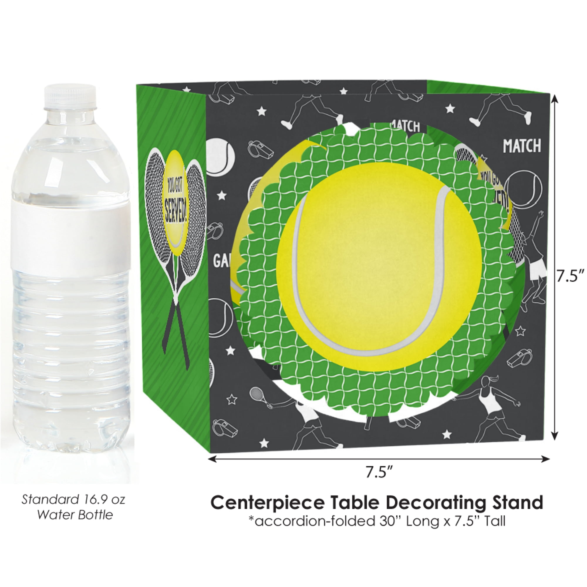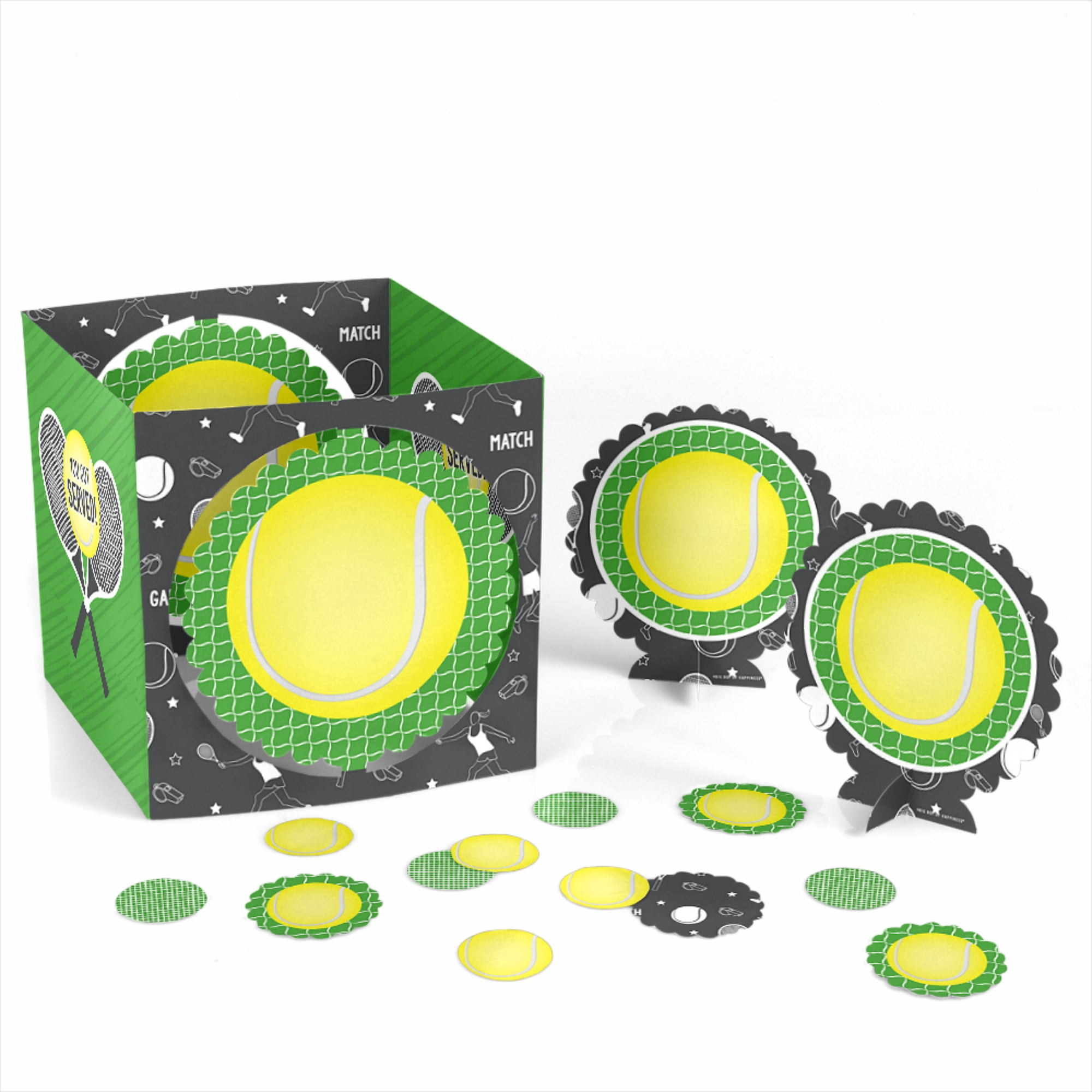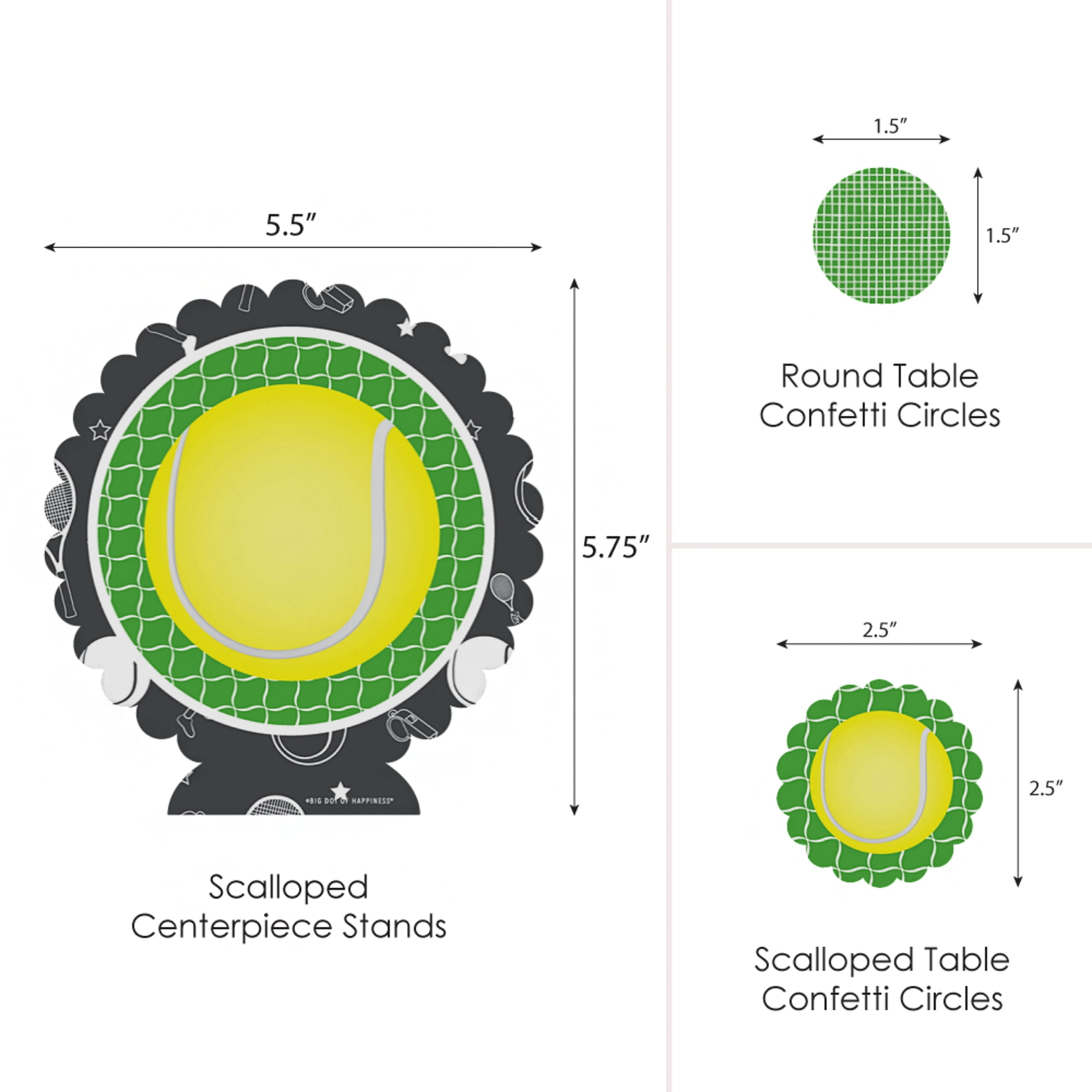 - You Got Served – Tennis party decoration kit SIZE 1 Accordion-Folded Centerpiece (may also be formed into a cube using the included stickers), 30" long x 7.5" tall; 2 Scalloped Centerpiece Stands, 5.5" wide x 5.75" tall; 12 Scalloped Table Confetti Circles, 2.5" diameter; and 24 Round Table Confetti Circles, 1.5" diameter. The unique design and variety of pieces makes this tennis team party decoration kit an impressive addition to any baby shower or tennis ball birthday party.