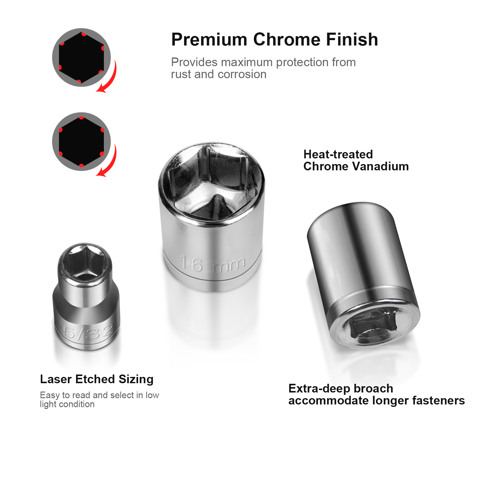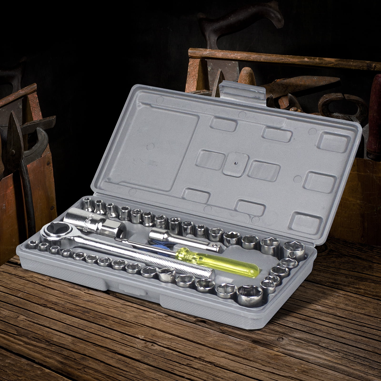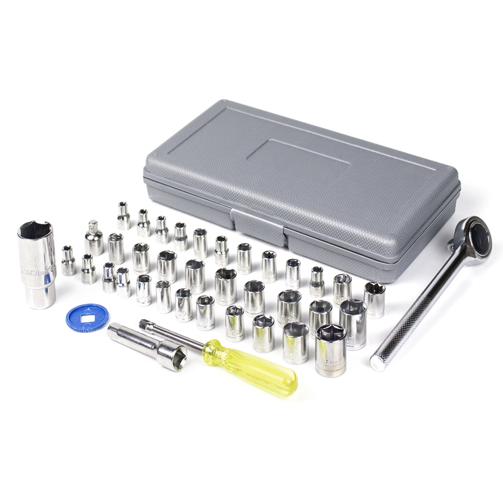 This is a ratchet wrench socket set has both Metric and SEA sized sockets in 1/4" and 3/8" drive set. The set delivers the performance and durability you need for any job in the garage or at home. 40 piece set includes ratchets, extension rods, 1/4" rotary handle, spark plug sockets, adapters, and more. In addition, large size markings on the tool surface for quick and easy identification without wasting time.