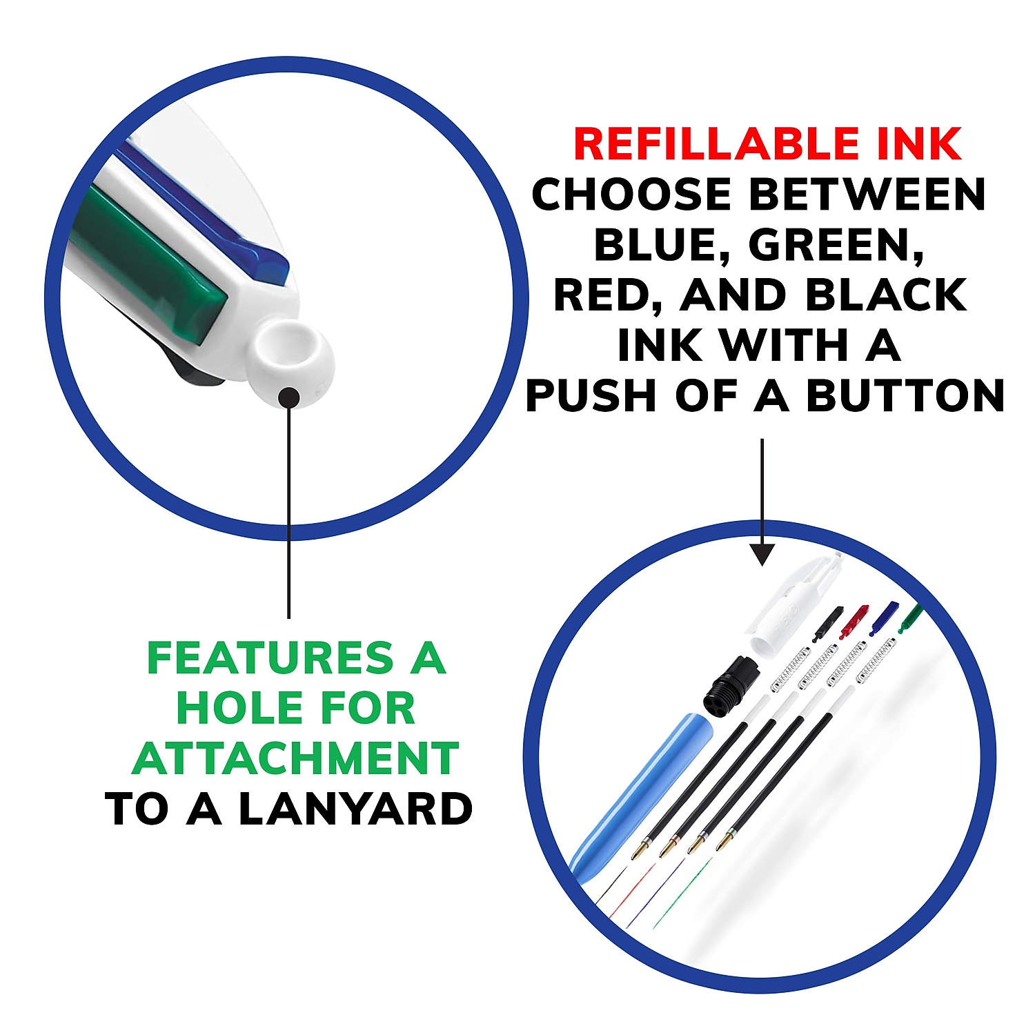 BIC 4-Color Medium Point Retractable Ballpoint Pen with a blue barrel and blue/black/red/green ink is specially designed for correcting papers and general record book entries.