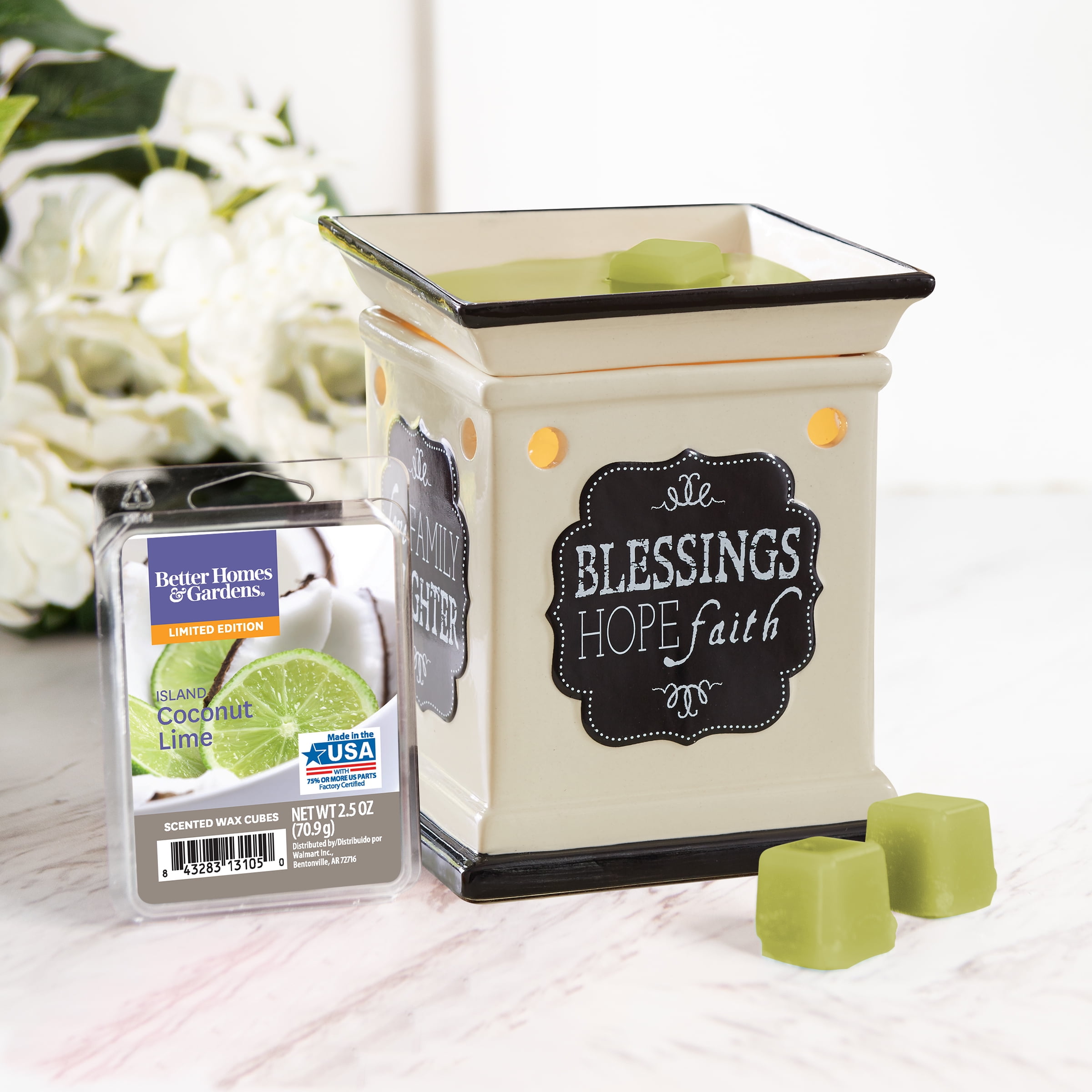 Better Homes & Gardens 2.5 oz Island Coconut Lime Scented Wax Melt features freshly fallen, cracked coconut fruit blended with the zesty brightness of island limes fused with sweet sugarcane and a hint of vanilla. Better Homes & Gardens 2.5 oz Island Coconut Lime Scented Wax Melts are for use in an electric wax warmer and release a soothing highly fragrant scent into the air immediately upon melting. They are ideal for spreading a relaxing scent and welcoming atmosphere throughout your home. Simply break off a piece and add it to your favorite electric wax warmer.