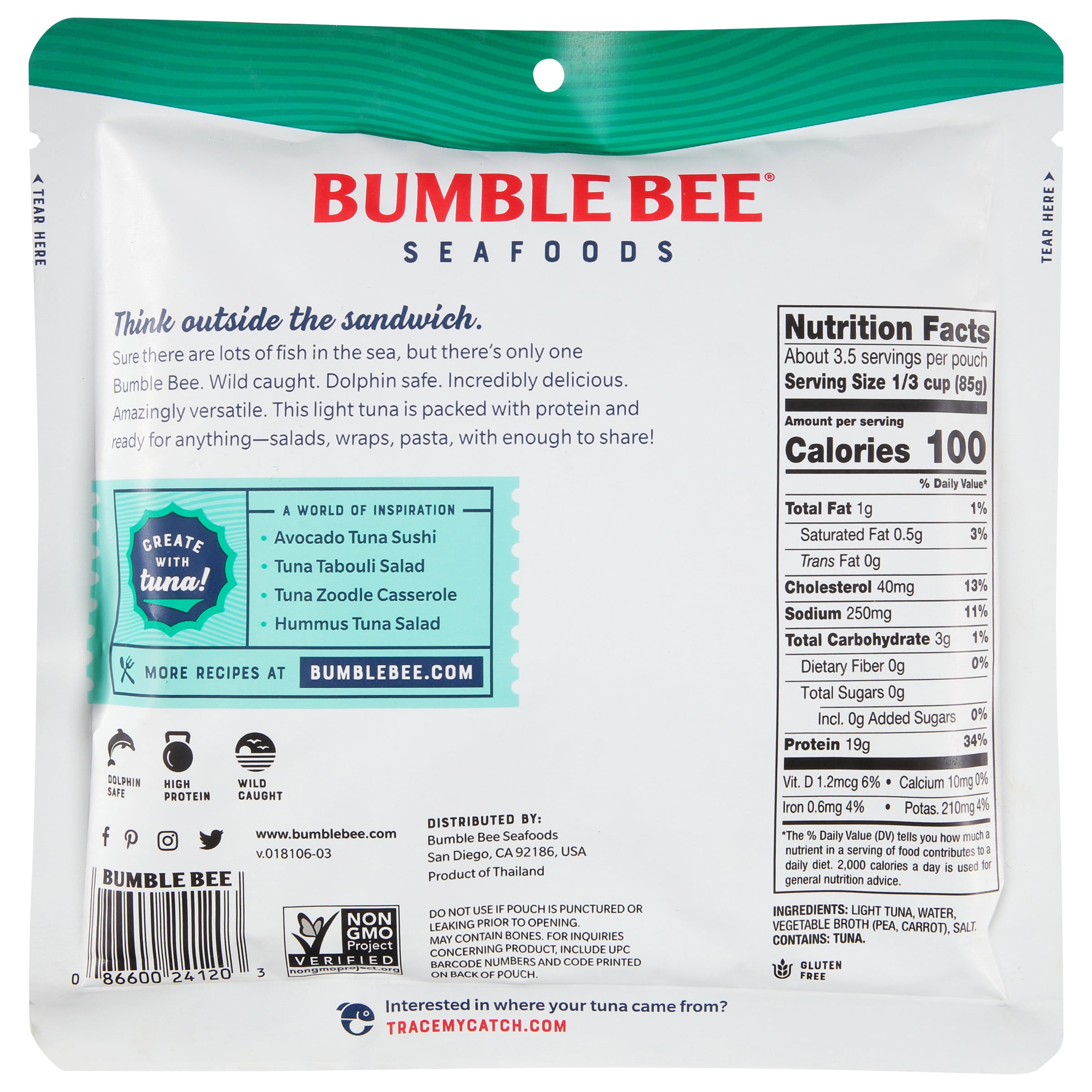 - SUSTAINABLE BUMBLE BEE TUNA: Bumble Bee tuna pouches are dolphin safe and feature a code you can enter on our Trace My Catch website to learn where and how your seafood was caught, processed and more