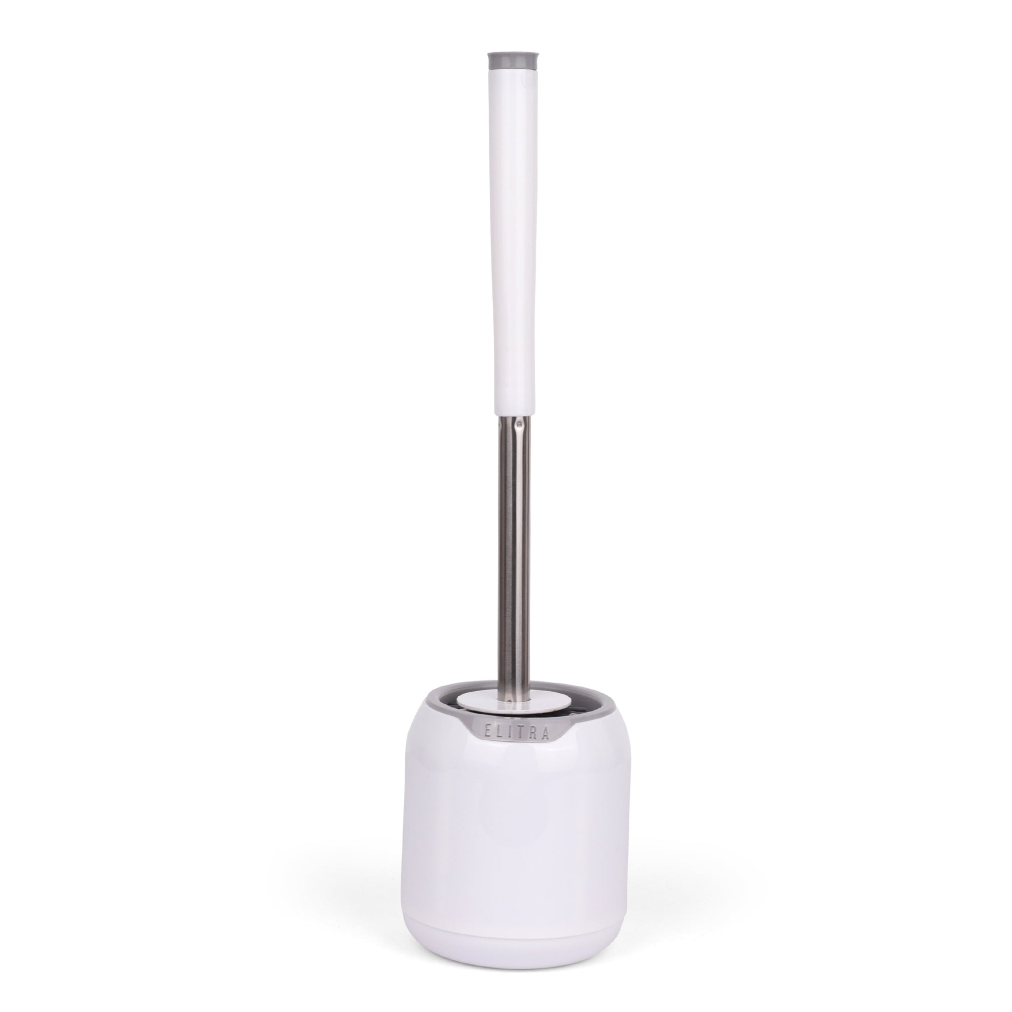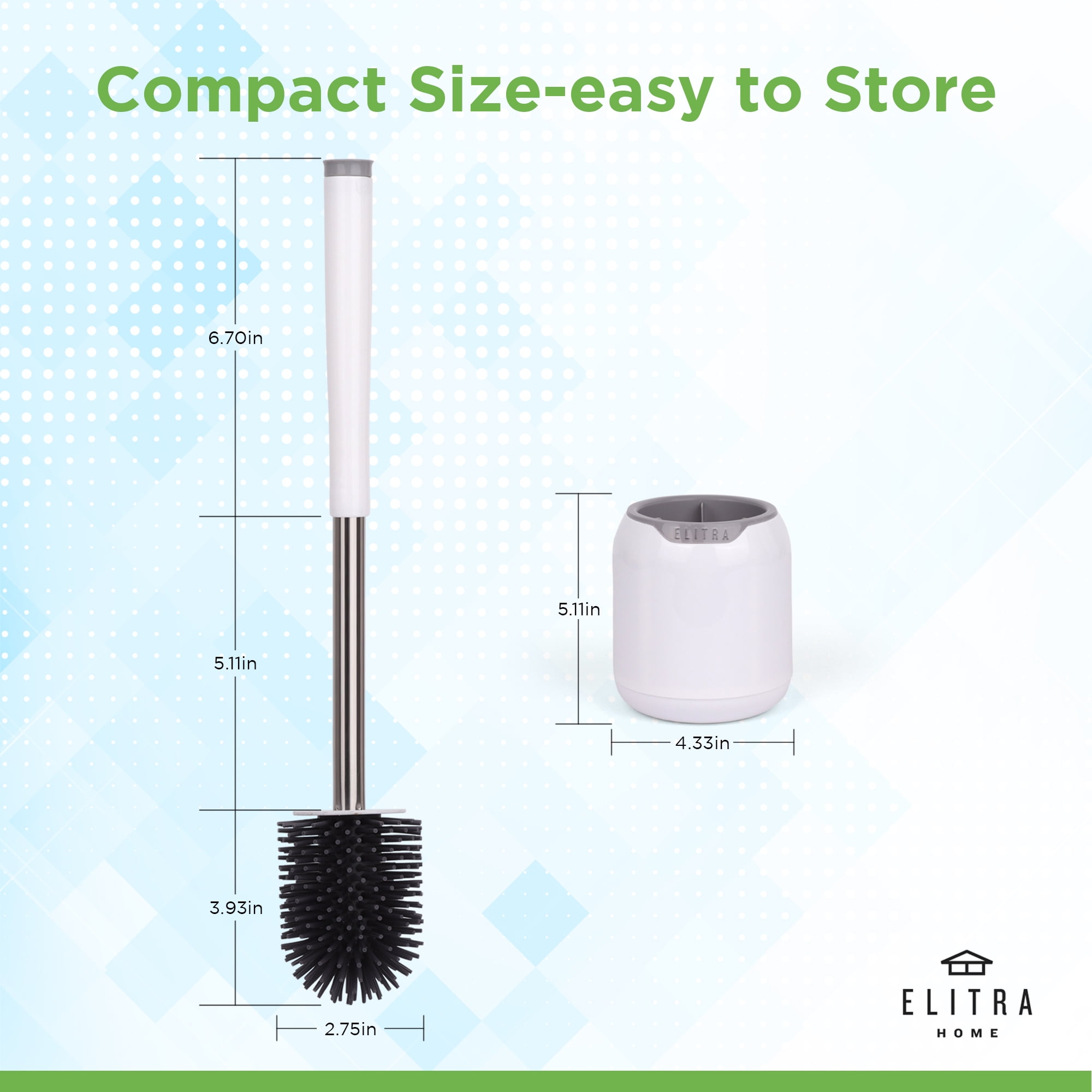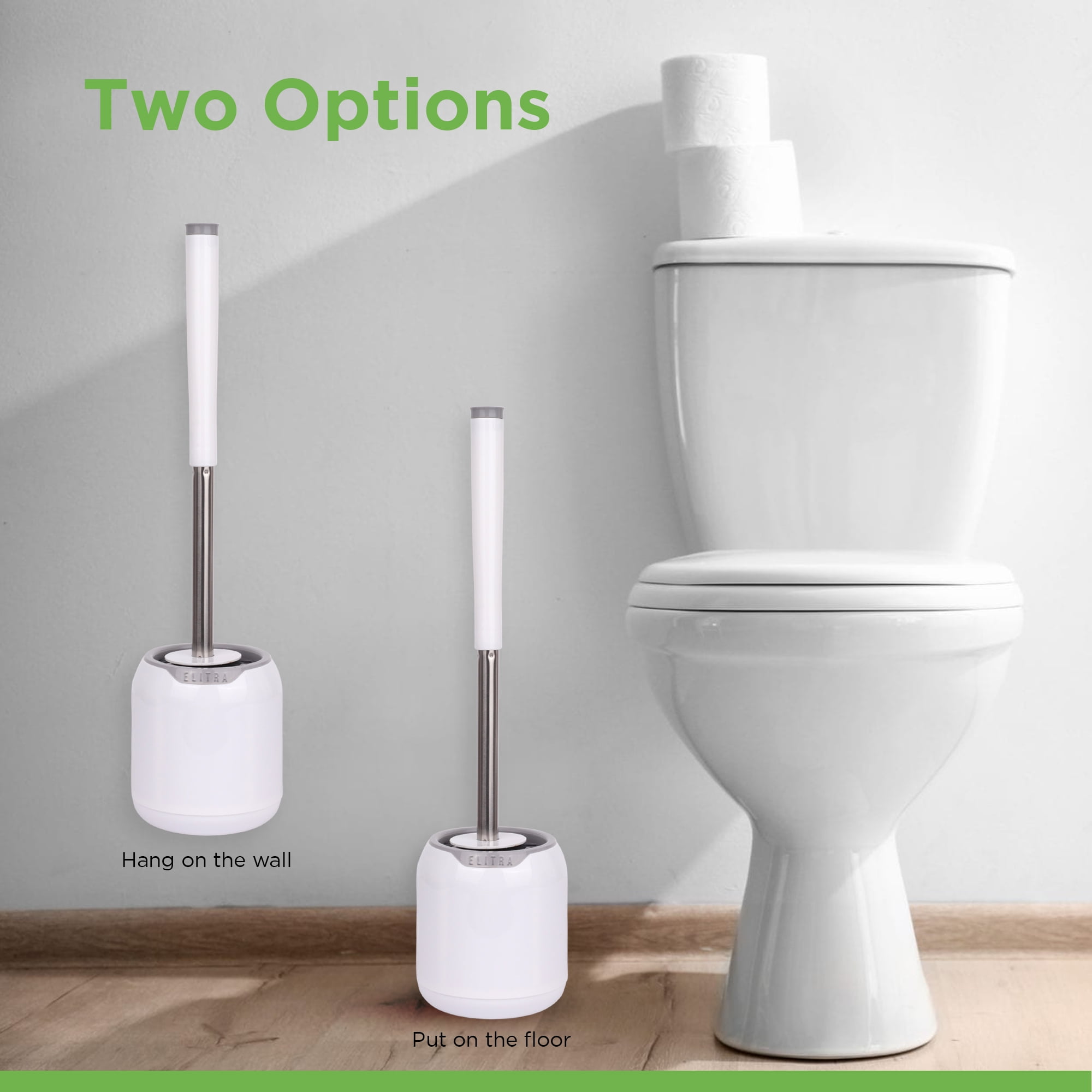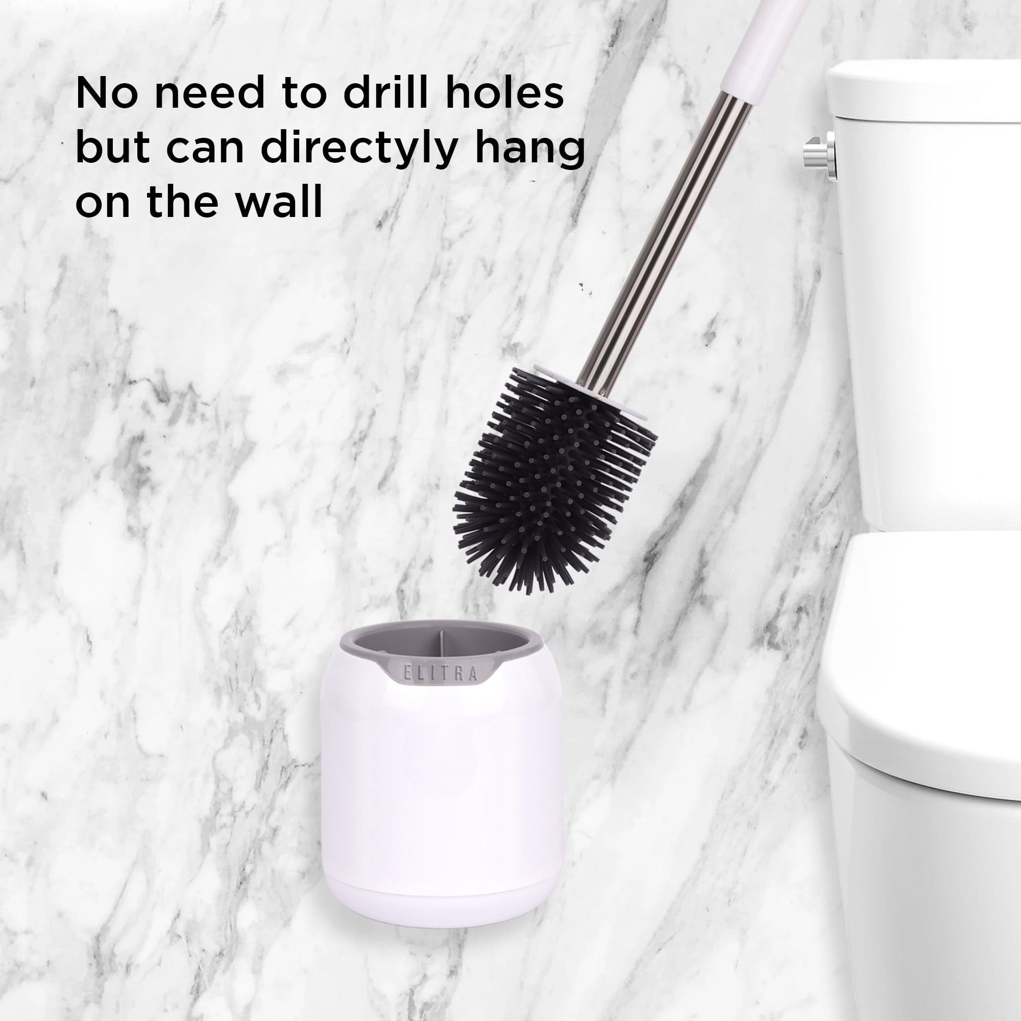 The Elitra Home Silicone toilet Brush is the ultimate tool to keep your toilet looking fresh and clean. The brush features high-quality thick, soft, and strong silicone bristles that scrub and removes stains easily. The brush pole is made of stainless steel, which is sturdy and rust-free. The brush cleans deeply into corners without scratching the glaze and picks up a hair on the floor quickly. The durable silicone material is less likely to wear and tear and will not break easily when scrubbing hard and dirty spots. The easy-to-clean washable brush head air dries fast in the included holder and prevents stains from sticking. The brush handle cleverly includes an invisible pull-out tweezer that is great for cleaning out stubborn hairs and other items that get trapped in the bristles. The brush stores in a high-quality thickened base that is designed to stay upright even when getting moved around or when putting the brush back in. For easy storage, the base comes with a sticker hook allowing it to be hung on the wall – without using screws!