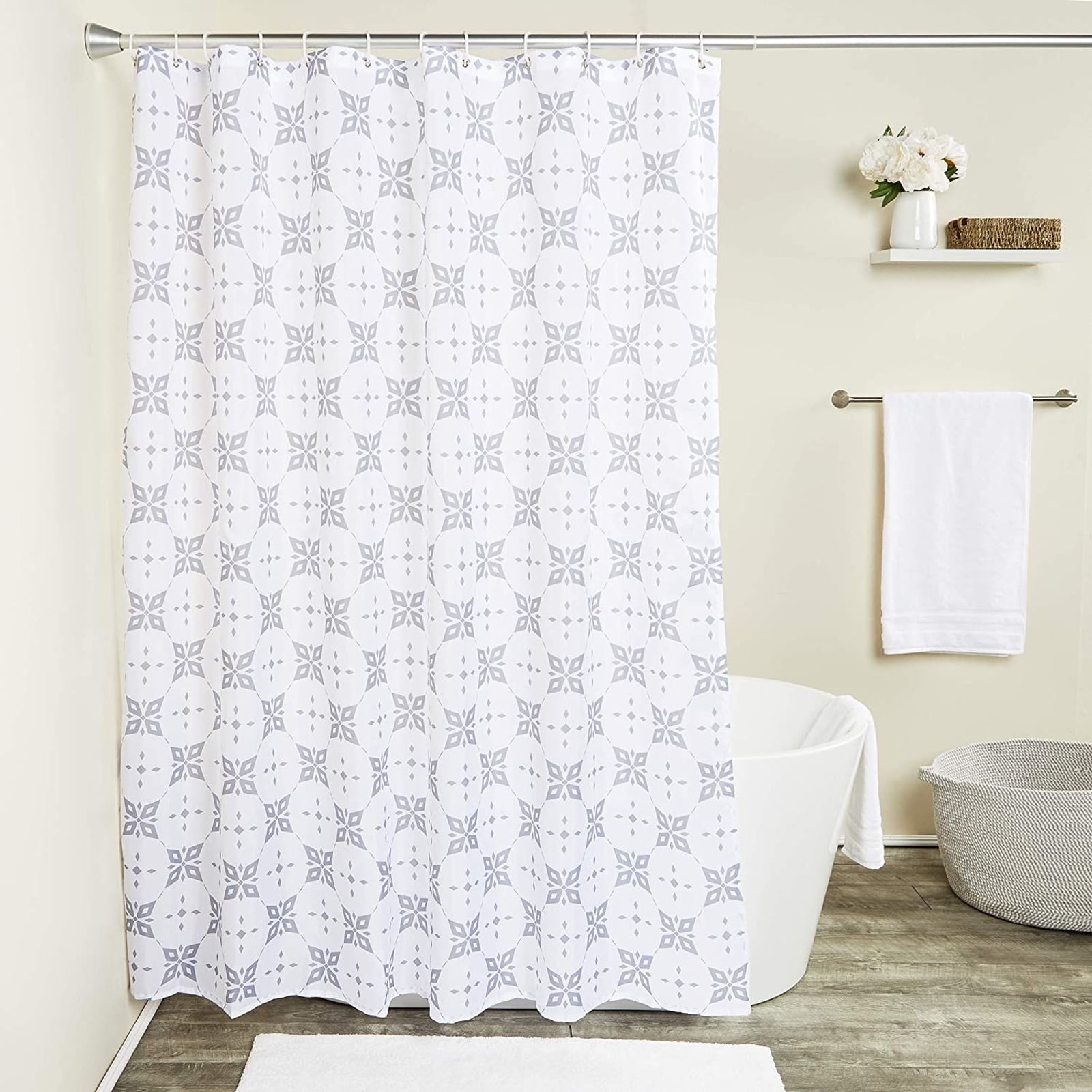- VERSATILE DESIGN: This farmhouse shower curtain features a decorative grey and white design printed throughout; an ideal choice for bathtubs and showers at home, campers, hotels, motels, and dorm rooms
